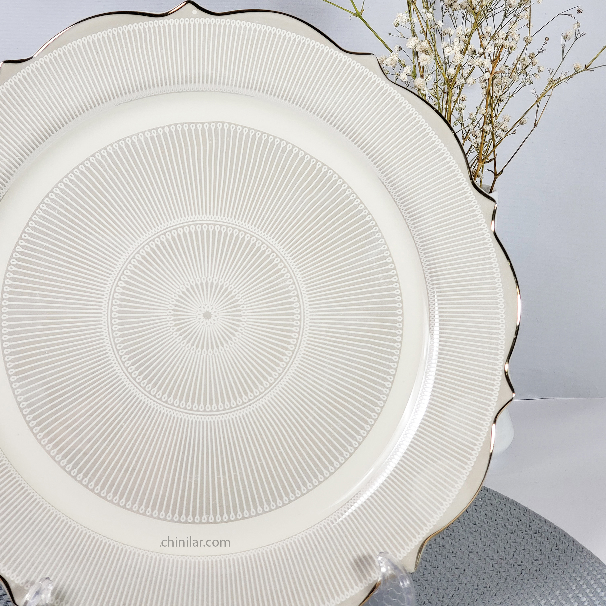 - طرح و تزئین: نقوش نقرهای منظم در مرکز بشقاب با لبههایی منقوش به طلای براق، چاپ شده با فناوری دکور ثابت که در برابر شستوشو و حرارت مقاوم است
