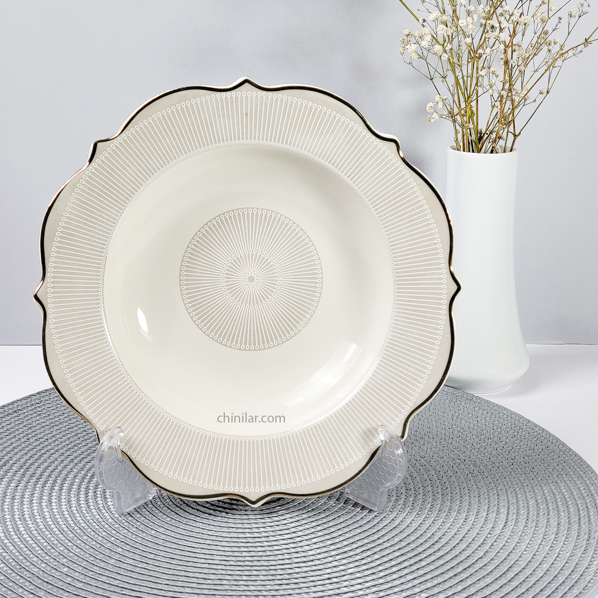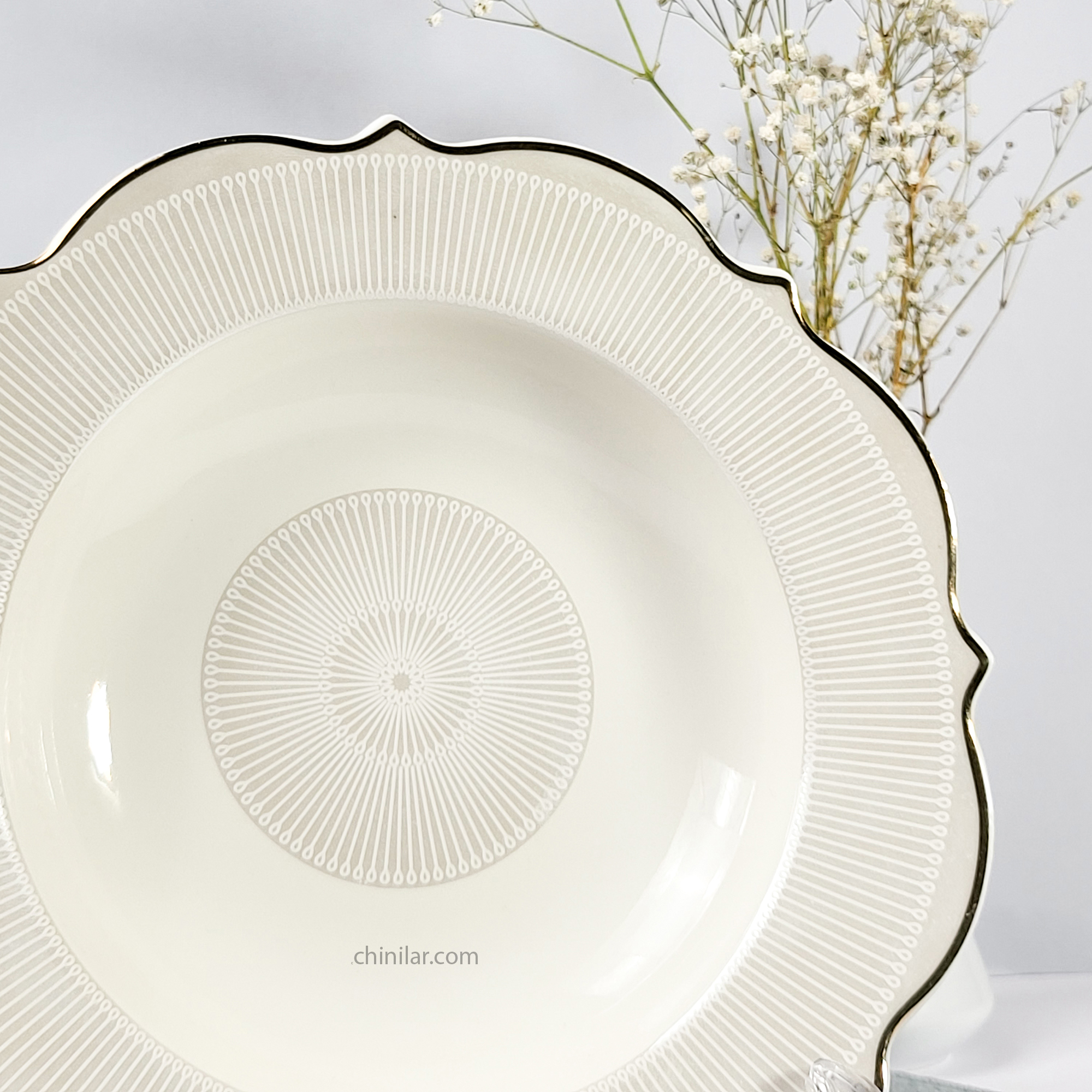 طرح: نقوش شعاعی نقرهای در مرکز ظرف، با نوار طلایی ظریف در لبهها؛ چاپ دکور ثابت مقاوم در برابر شستوشو
