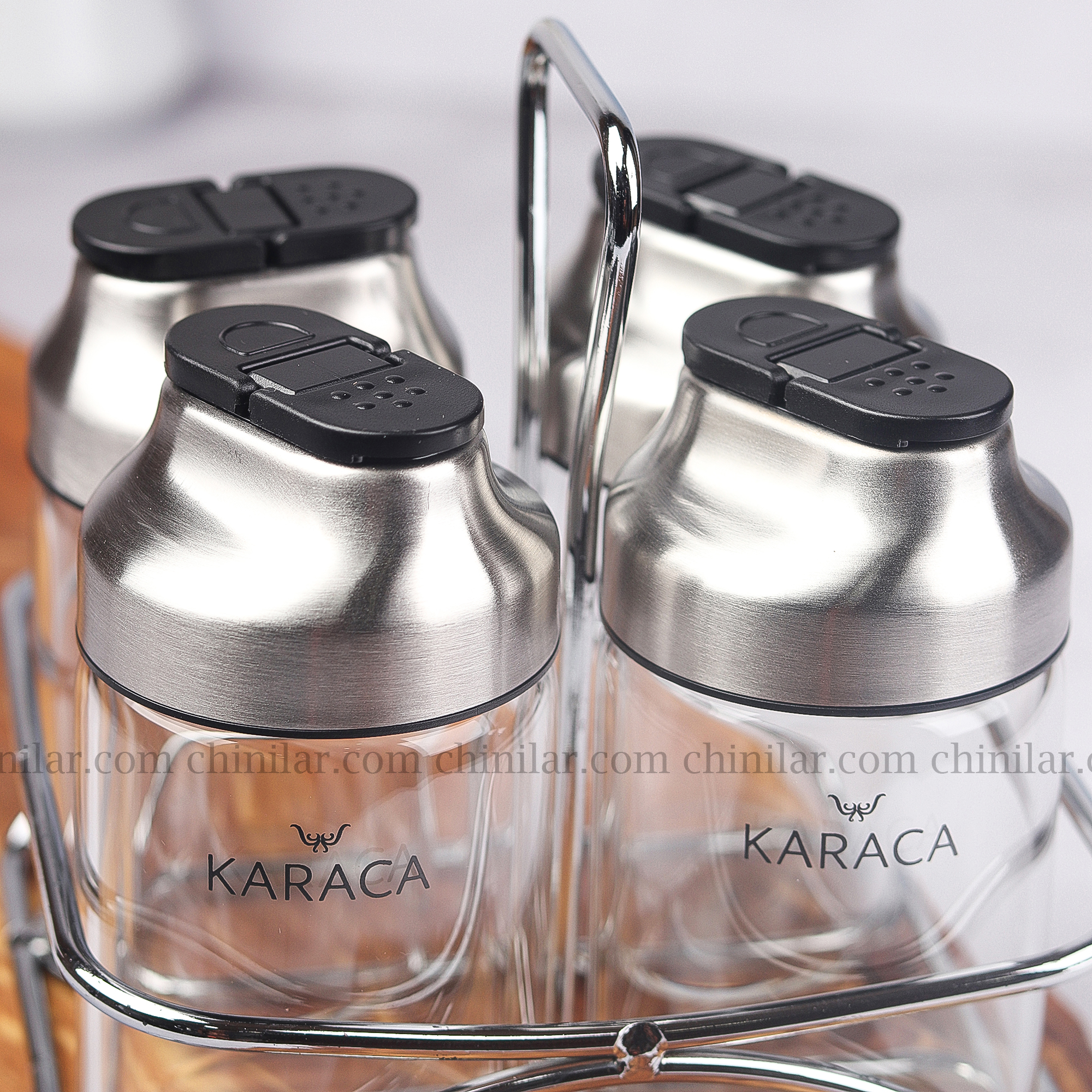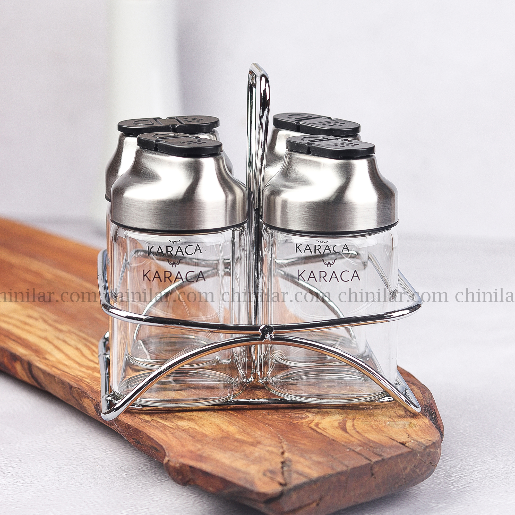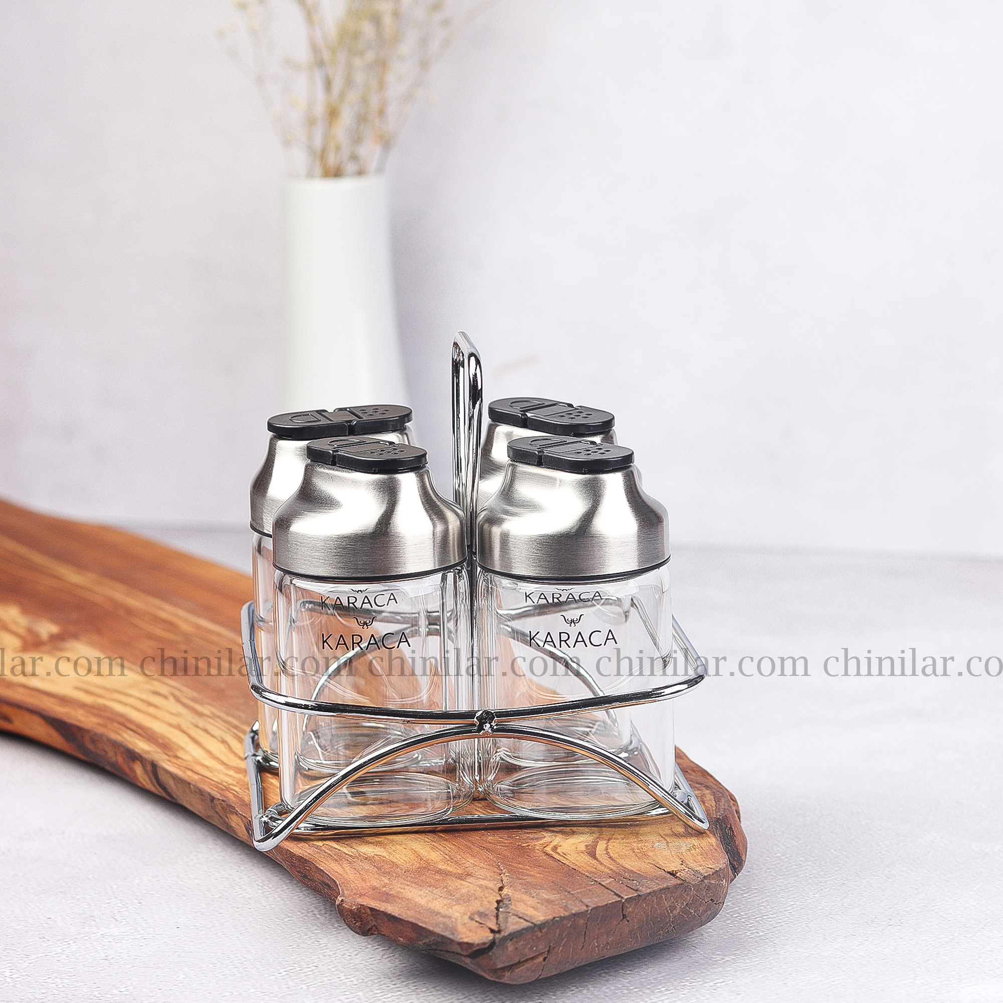استند فلزی این ست با طراحی جمعوجور، فضای کمی از میز یا کابینت شما اشغال میکند، درحالیکه چهار جاادویه شیشهای شفاف آن، به شما امکان میدهد محتویات داخل را بهراحتی ببینید و به آشپزخانهتان جلوهای مدرن و مرتب بدهید.