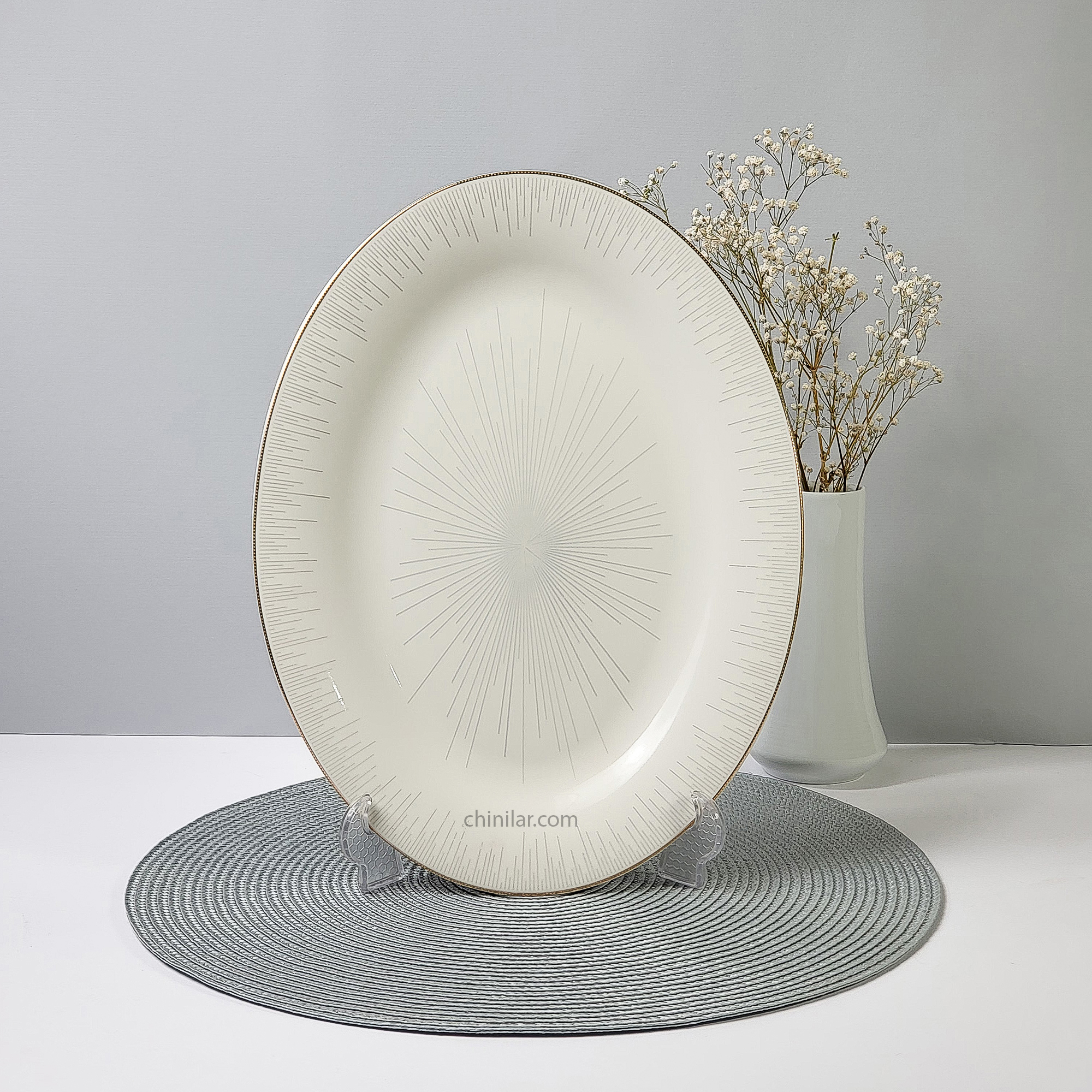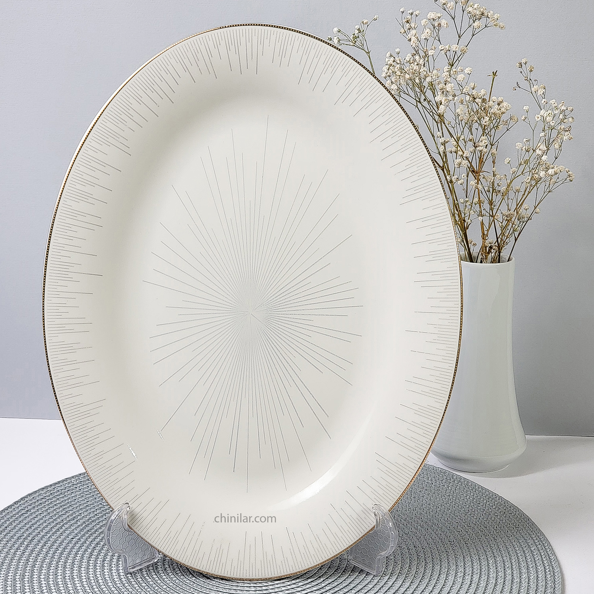 طراحی شعاعی نقرهای در مرکز دیس، همراه با خطوط ظریف لبطلایی، نمایی فاخر و رسمی به آن میبخشد که در مهمانیها، مجالس رسمی و چیدمانهای خاص جلوهای چشمگیر دارد. این سایز از دیس برای سرو برنج، مرغ، ماهی، خوراک یا انواع پیشغذاها بسیار مناسب و کارآمد است.