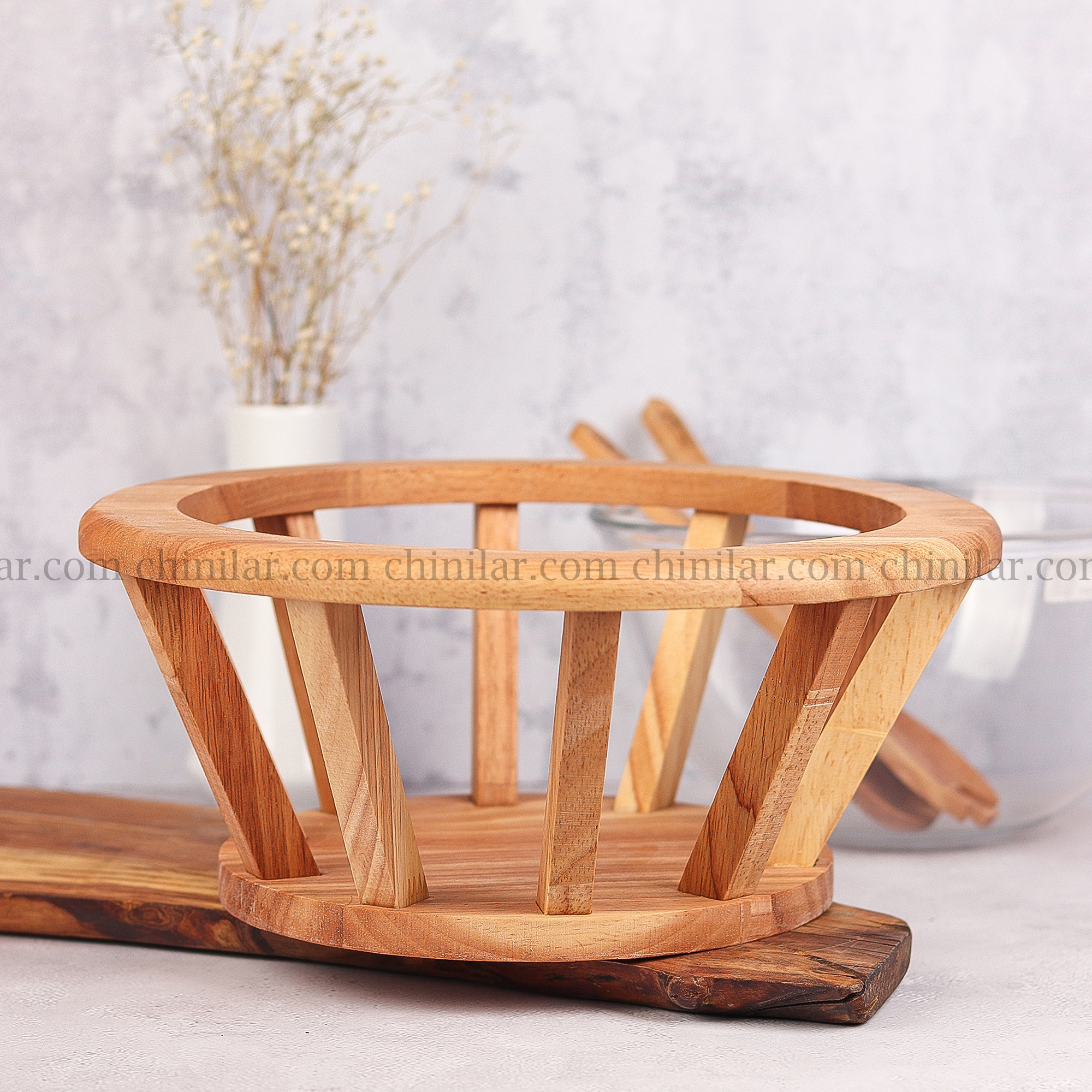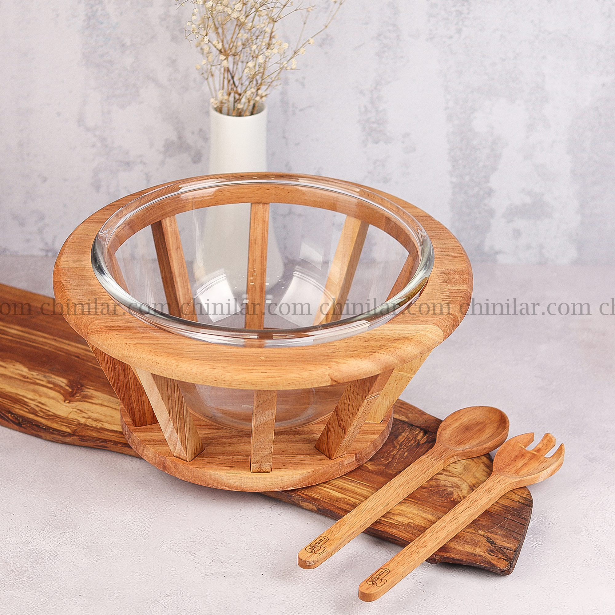 1 عدد کاسه شیشه ای + 1 عدد پایه چوبی + 1 عدد چنگال 1 عدد قاشق چنگال چوبی