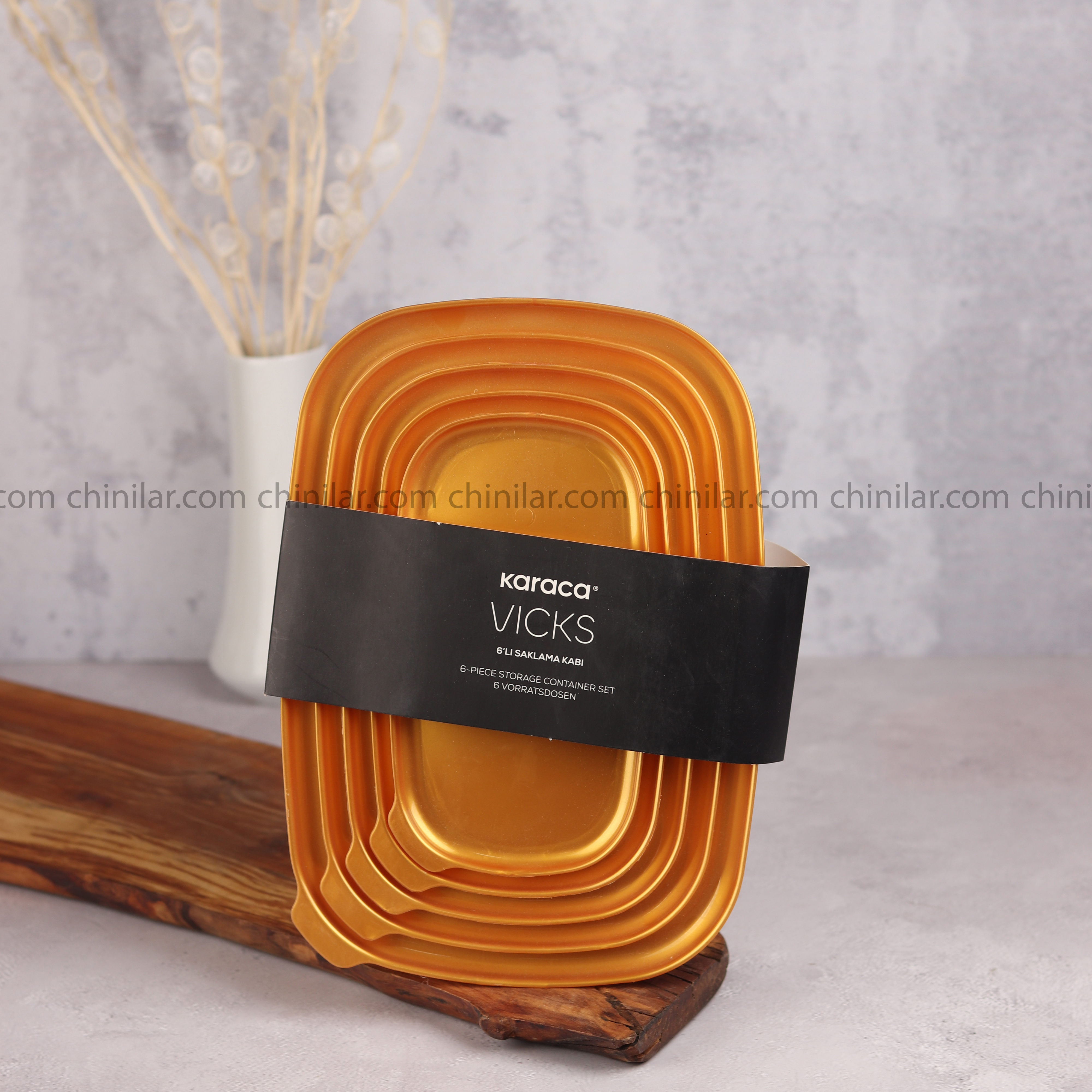 ست ۶ عددی ظرف نگهدارنده KARACA مدل VICKS انتخابی عالی برای هر کسی است که میخواهد مواد غذاییاش را مرتب، تازه و بدون بو نگه دارد. طراحی مستطیلی و مدرن با رنگ طلایی جذاب باعث میشود این ظروف نهتنها کاربردی، بلکه جلوهای بسیار شیک در آشپزخانه و یخچال ایجاد کنند.