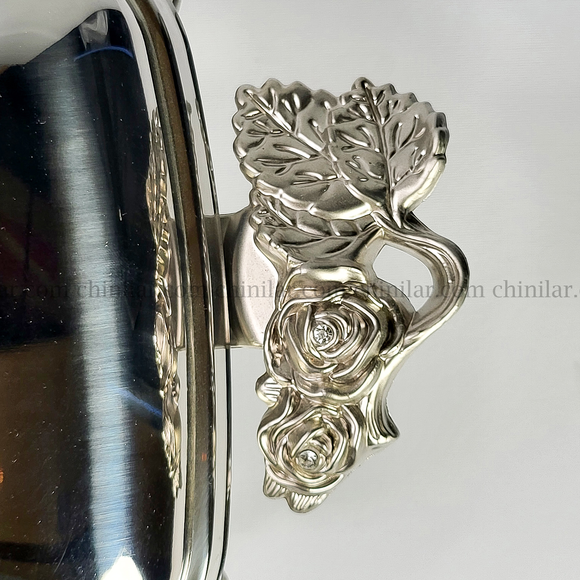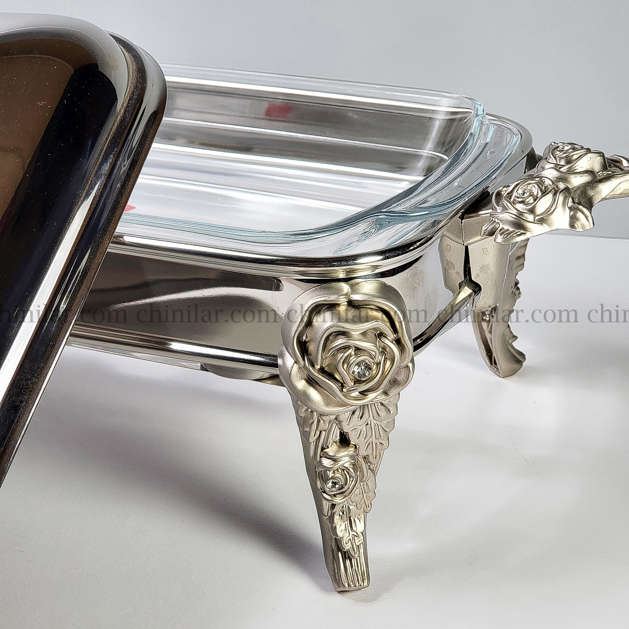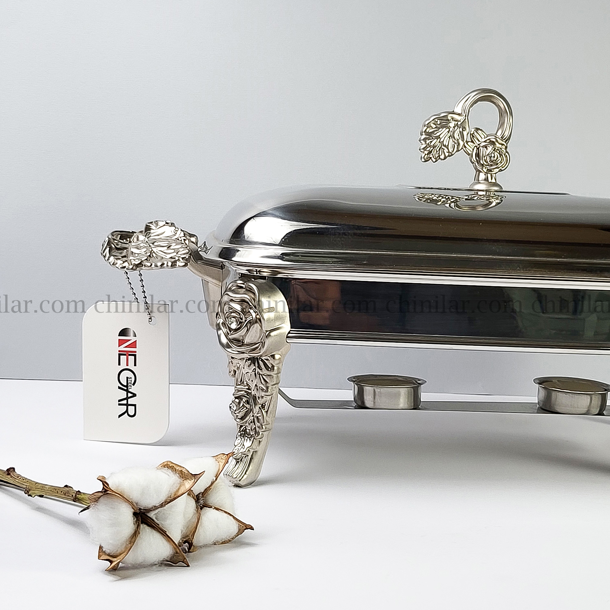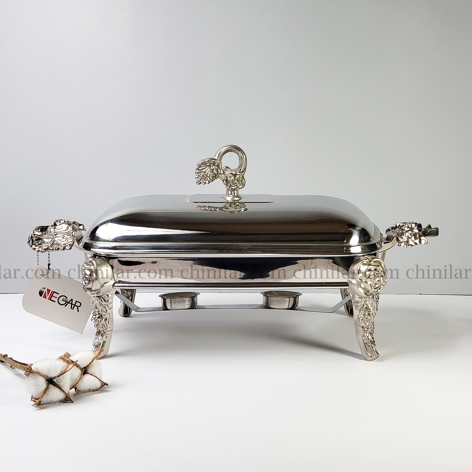 سوفله خوری مستطیل نگار با سایز بزرگ و طراحی شیک، انتخابی عالی برای سرو غذاهای گرم و پذیرایی در مهمانیهاست. این محصول از استیل ضدزنگ با کیفیت بالا ساخته شده و با دستهها و پایههای ABS در رنگ نقرهای، جلوهای مدرن و شکیل به میز شما میبخشد.