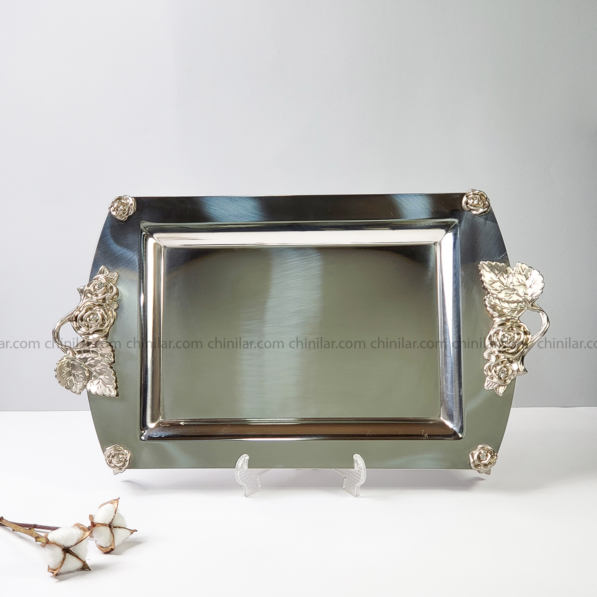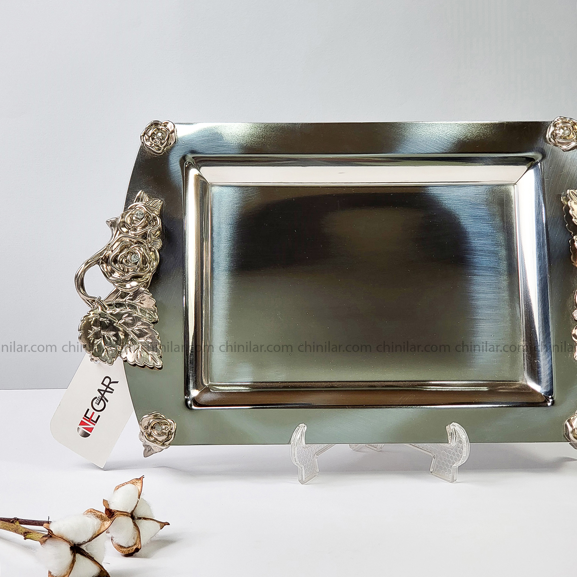 سینی استیل نگار طرح رز کد 302 سایز بزرگ تمام نقره ای