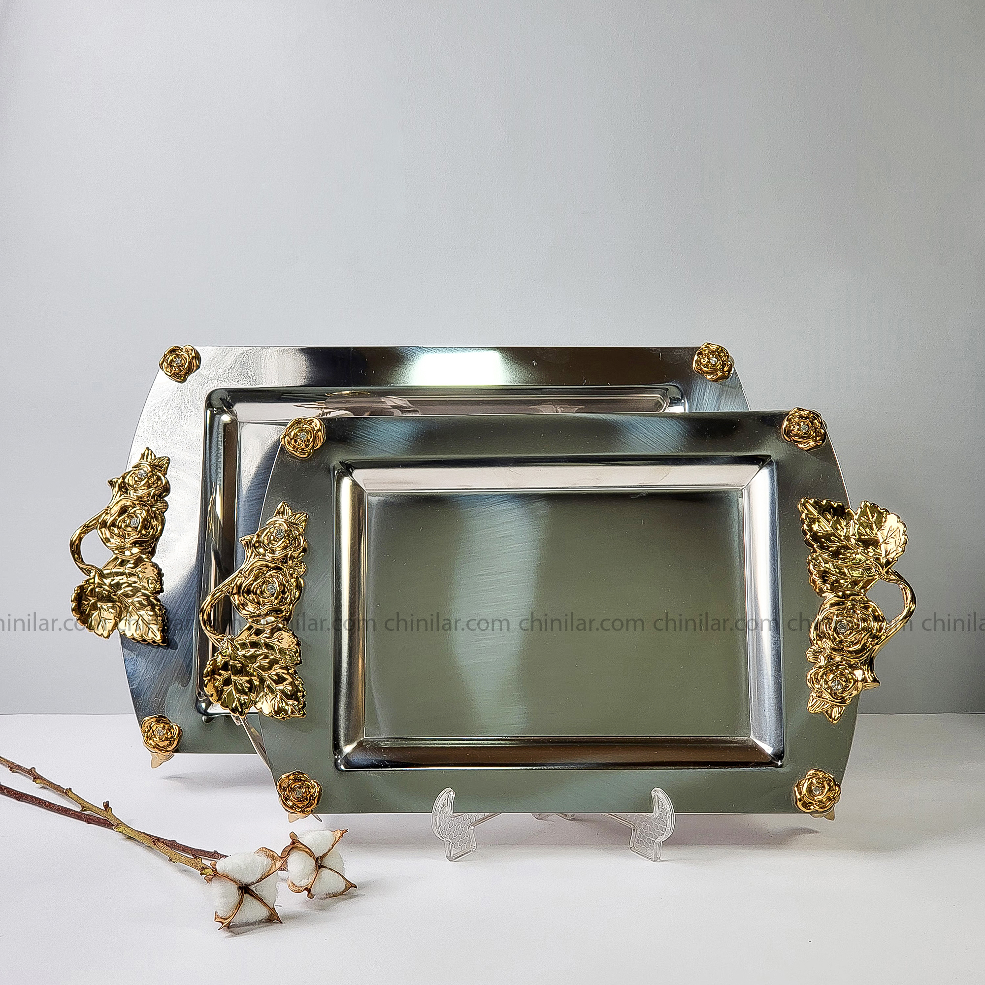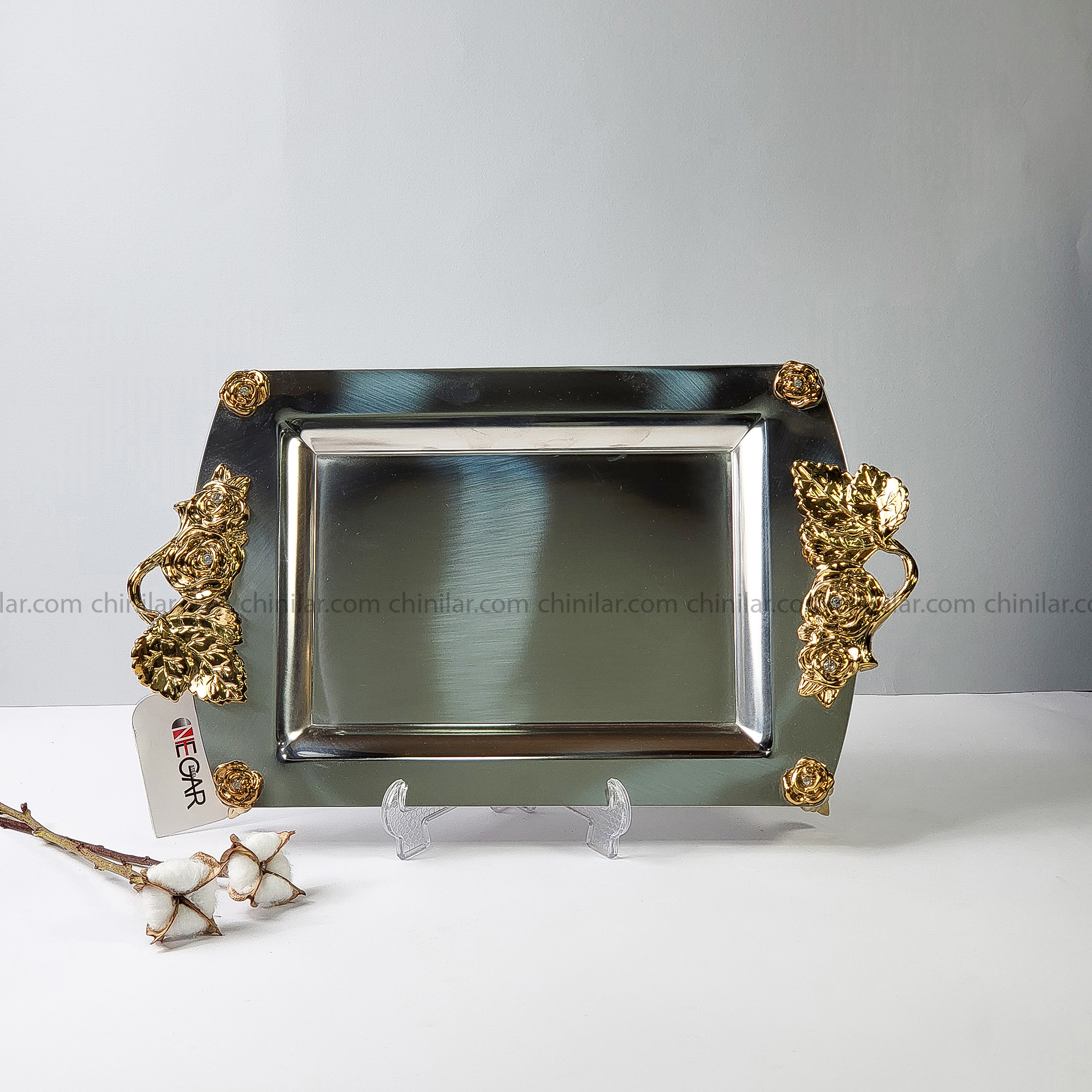 سینی استیل نگار طرح رز سایز متوسط دسته طلایی – کد 310