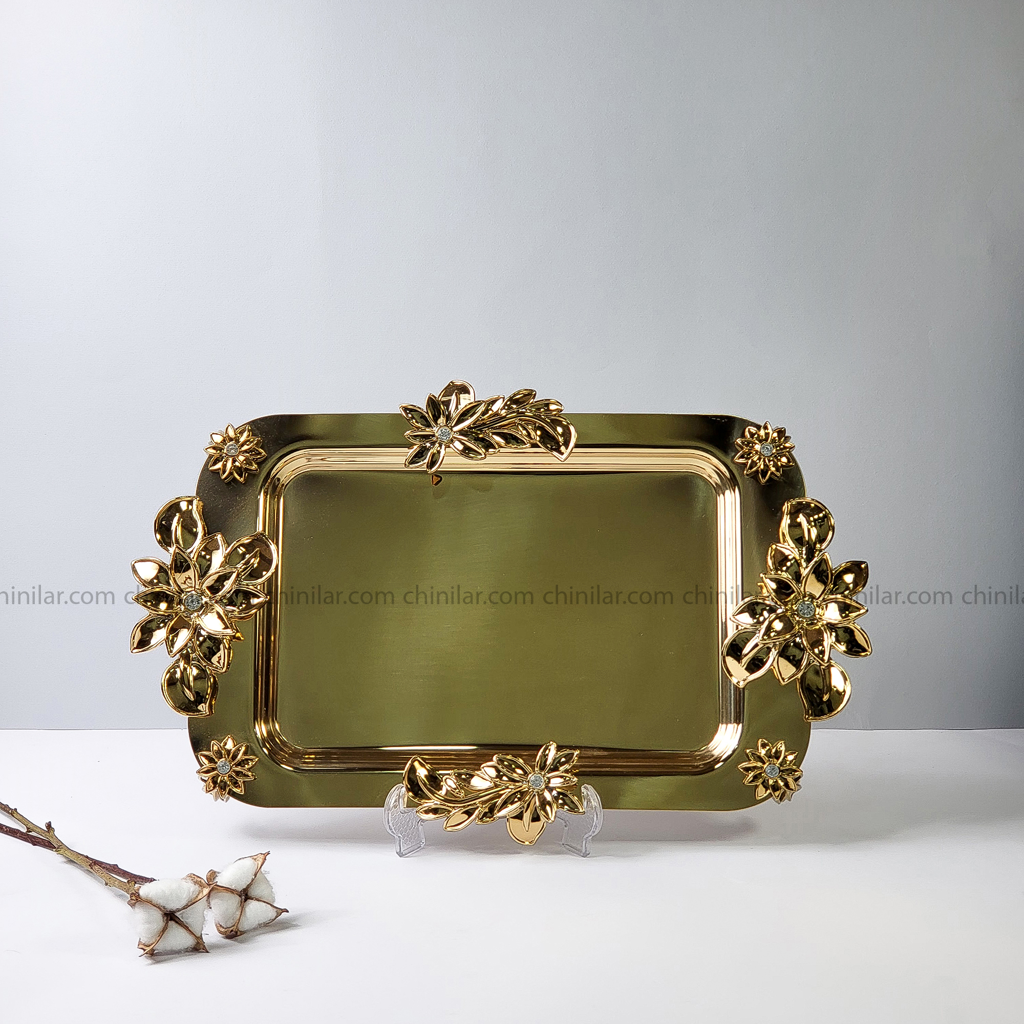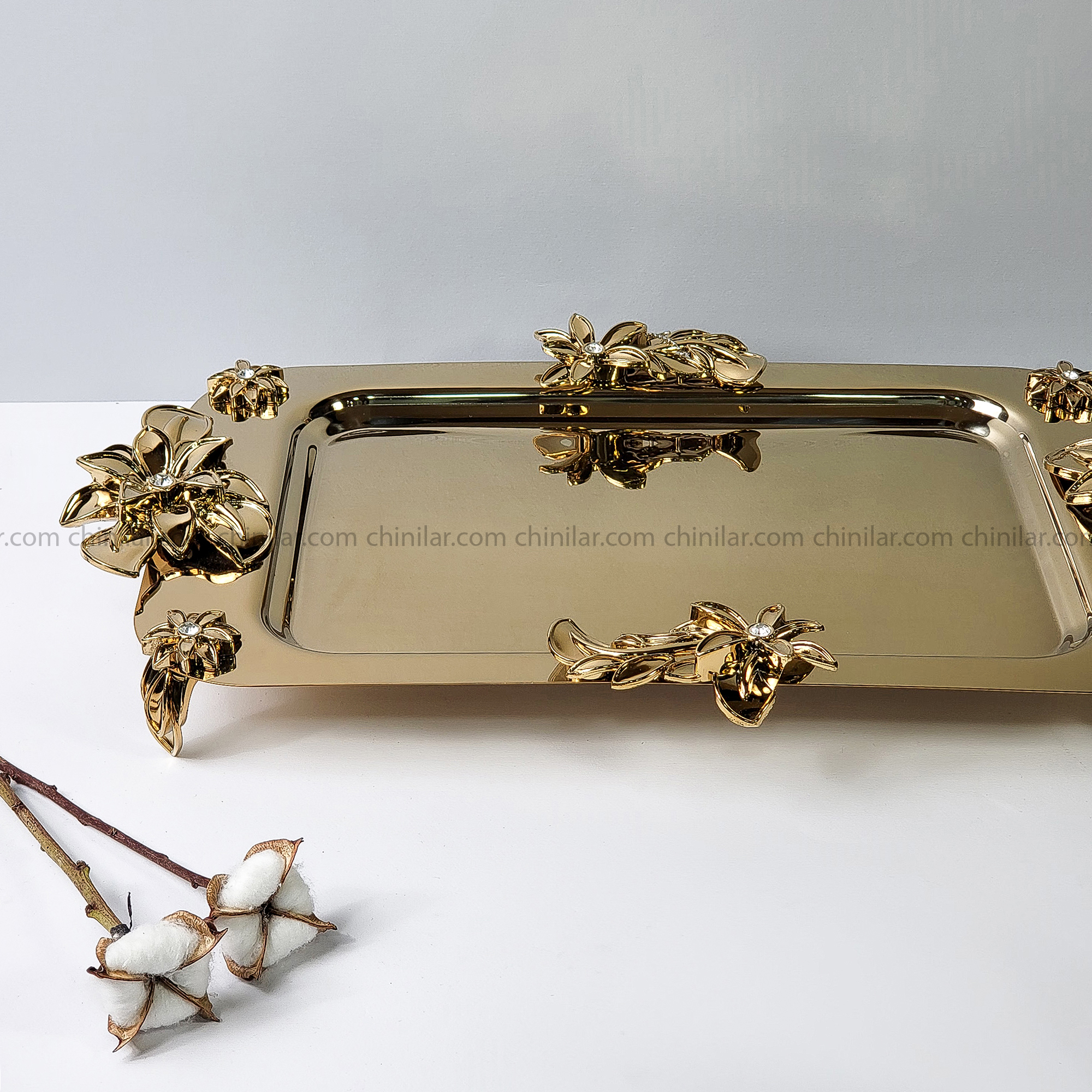 سینی استیل نگار طرح لیلیوم کد 632 – سایز متوسط، تمام طلایی