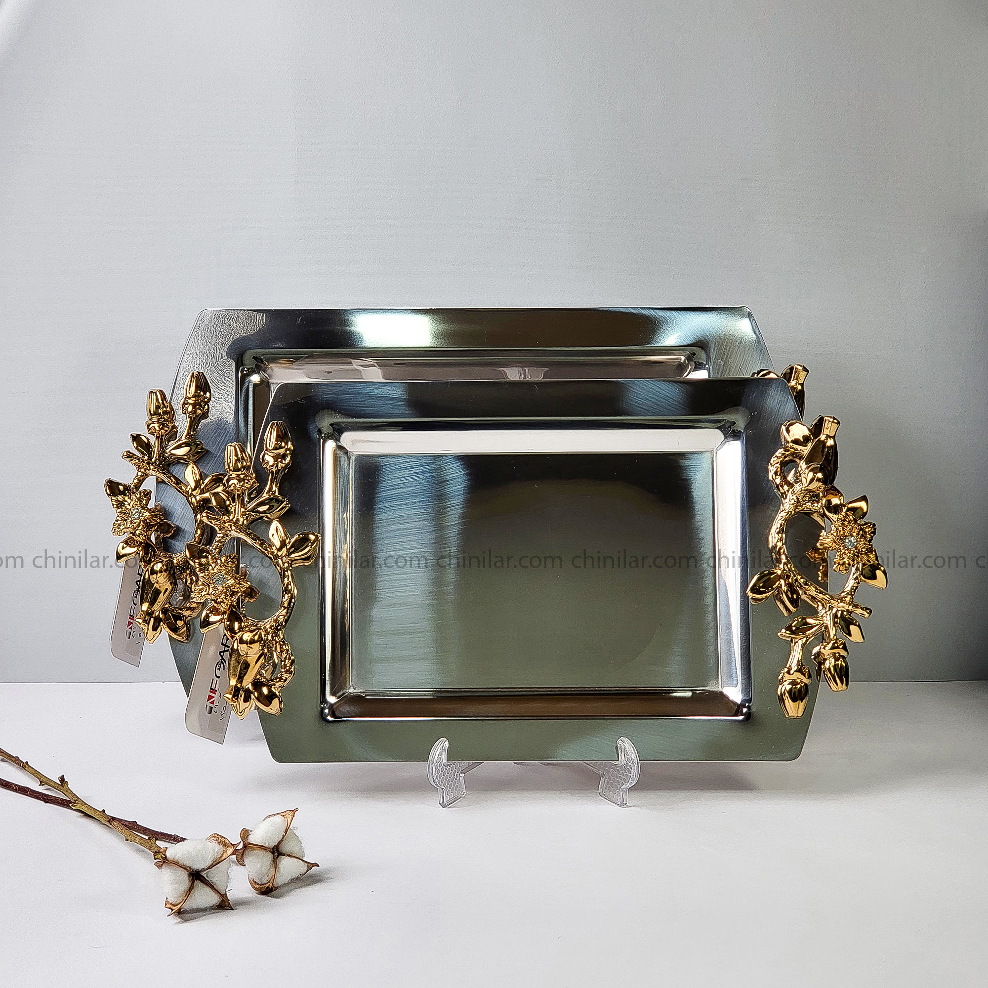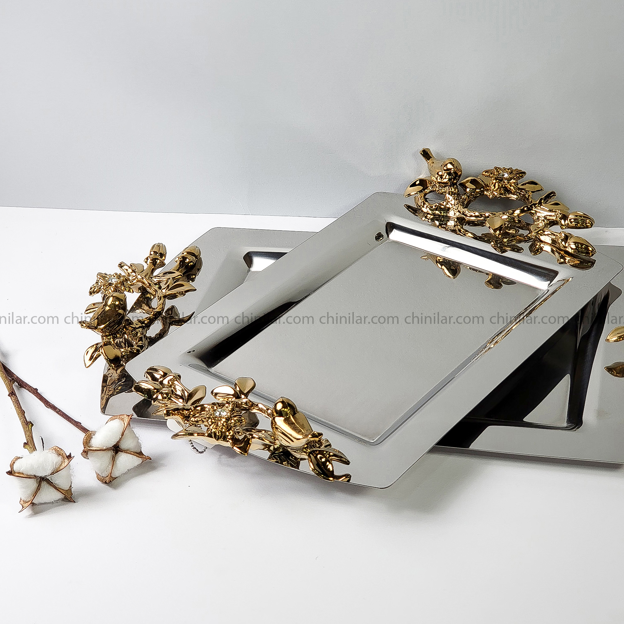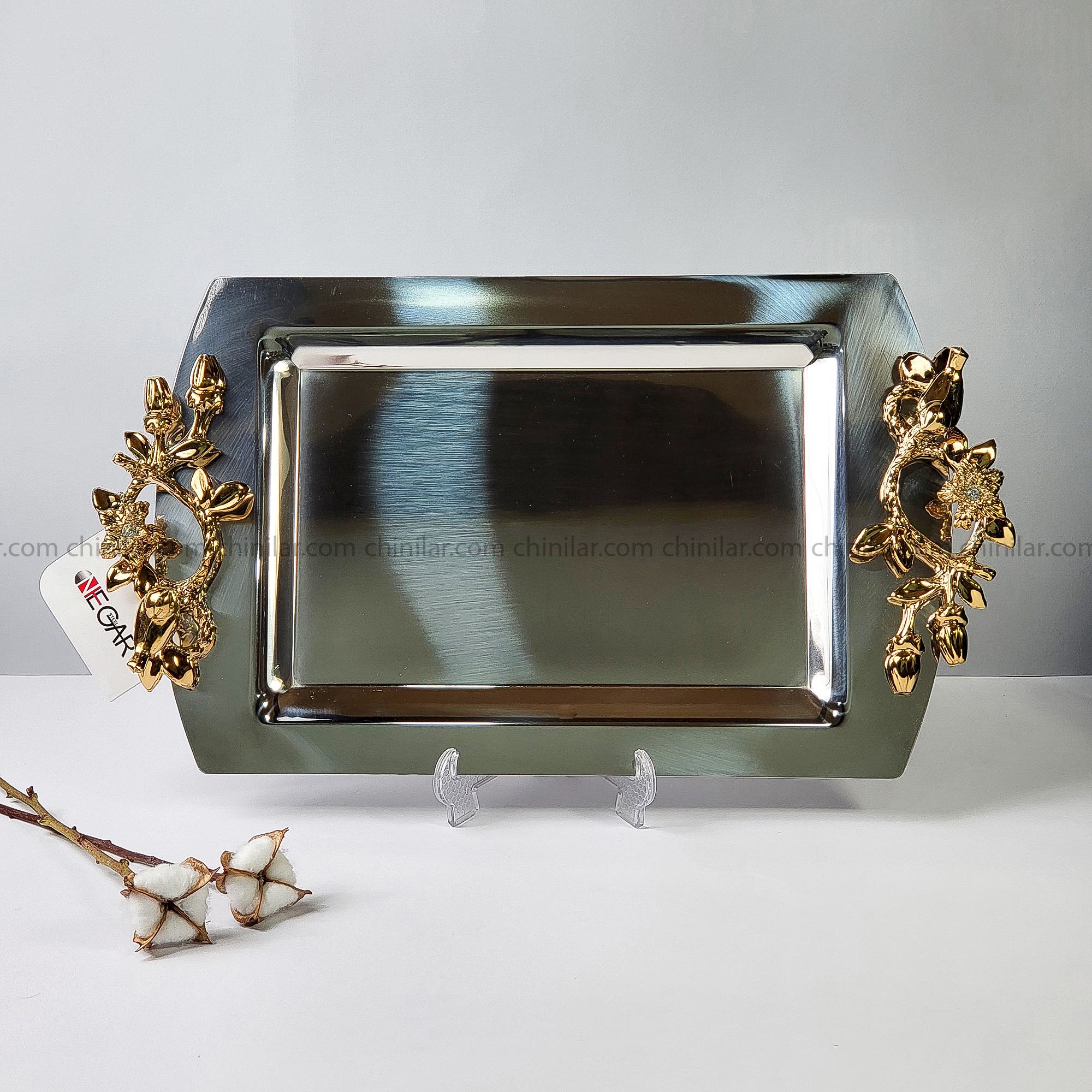 سینی استیل نگار طرح مرغ آمین کد 492 – سایز بزرگ، دسته طلایی