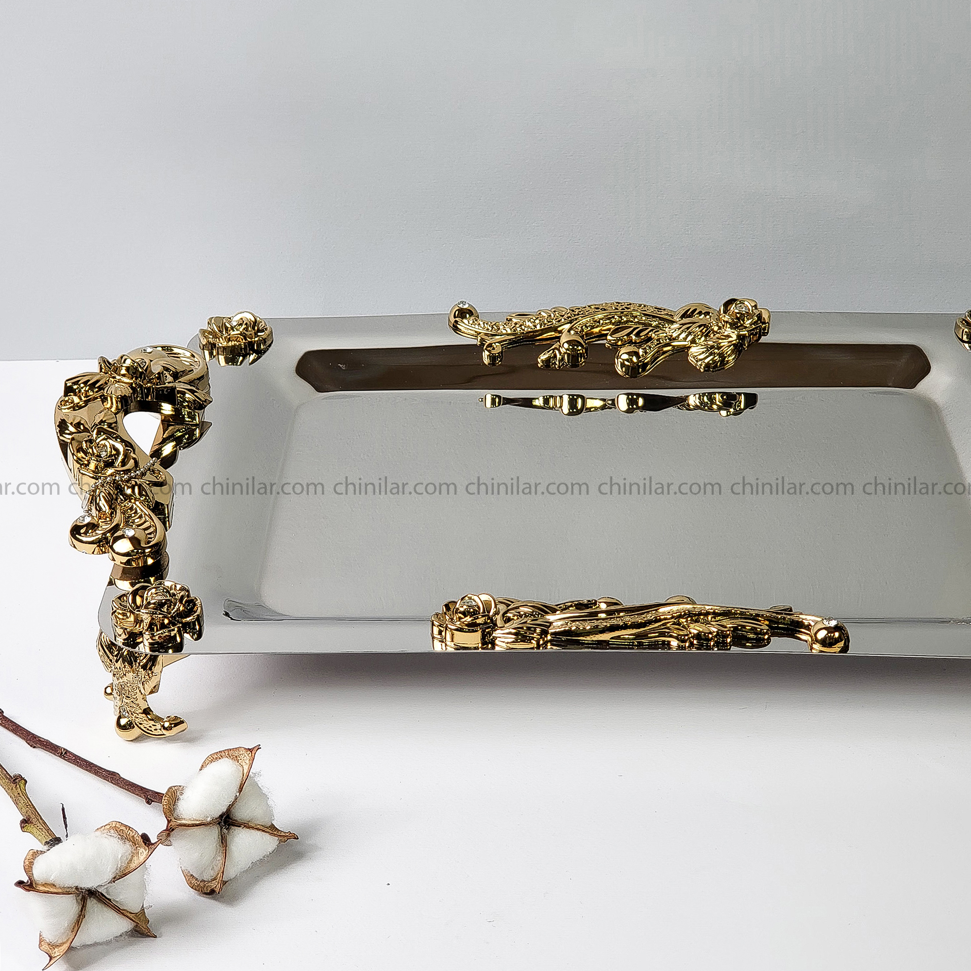 طرح ظریف و چشمنواز گلستان با رنگ طلایی روی دستههای سینی حک شده و جلوهای کلاسیک و شیک به آن بخشیده است. دستهها و پایهها از جنس ABS با آبکاری طلایی ثابت هستند که به مرور زمان تغییر رنگ نمیدهند و لایه آبکاری آنها پوستهپوسته نمیشود.