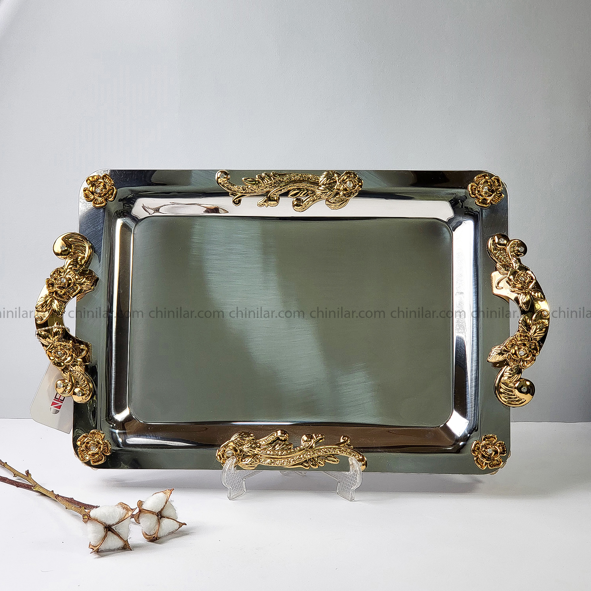 سینی استیل نگار طرح گلستان کد 420 – سایز بزرگ، تمام طلایی