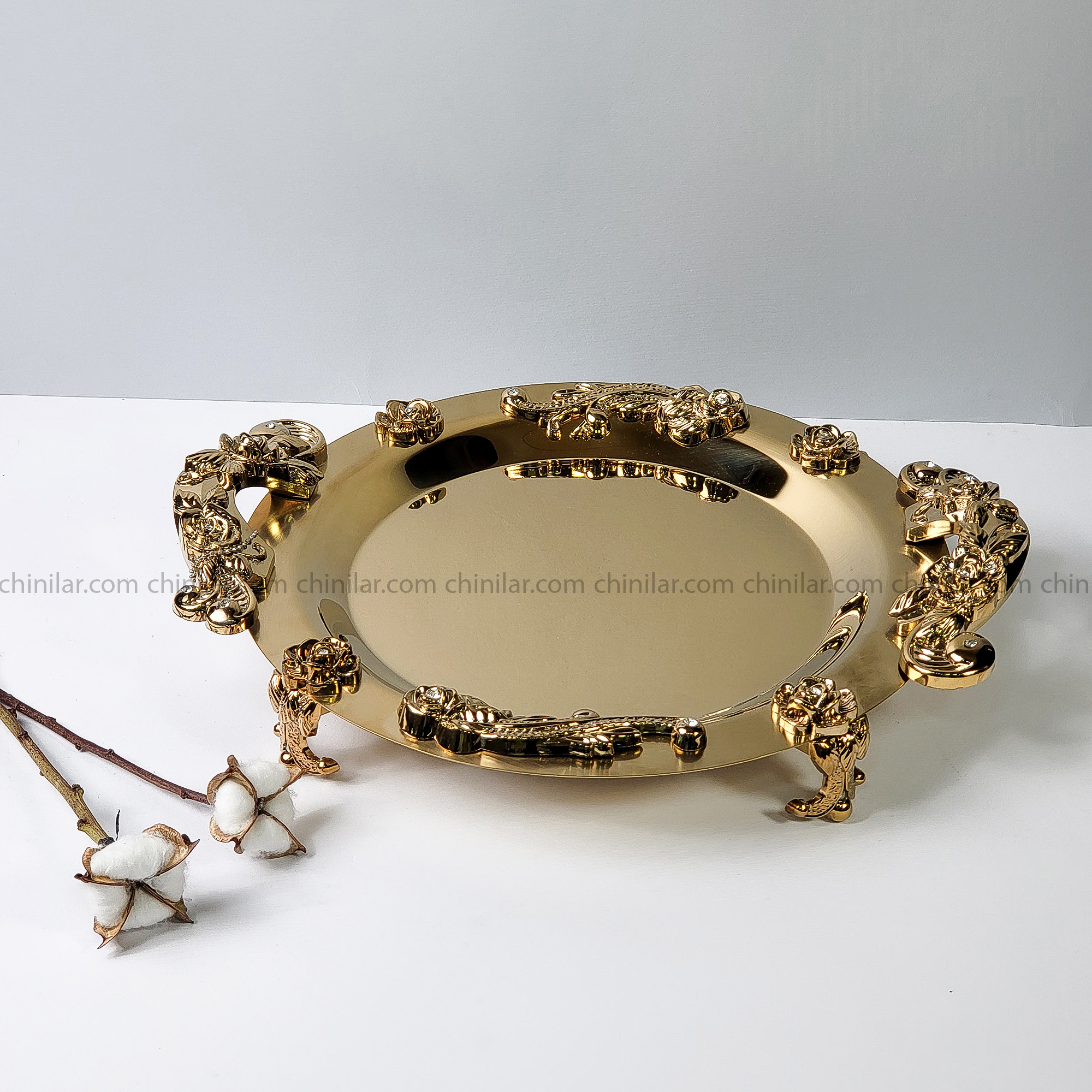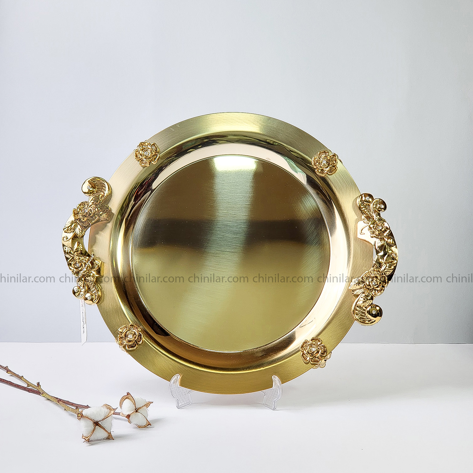 طرح ظریف و کلاسیک گلستان بهصورت حکاکی یا آبکاری روی دستههای طلایی اجرا شده است. این دستهها از جنس ABS با آبکاری ثابت ساخته شدهاند که تغییر رنگ یا پوستهپوسته شدن ندارند. وجود پایههای مقاوم باعث میشود سینی هنگام قرار گرفتن روی میز ثبات بیشتری داشته باشد.