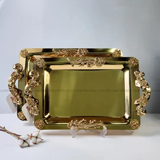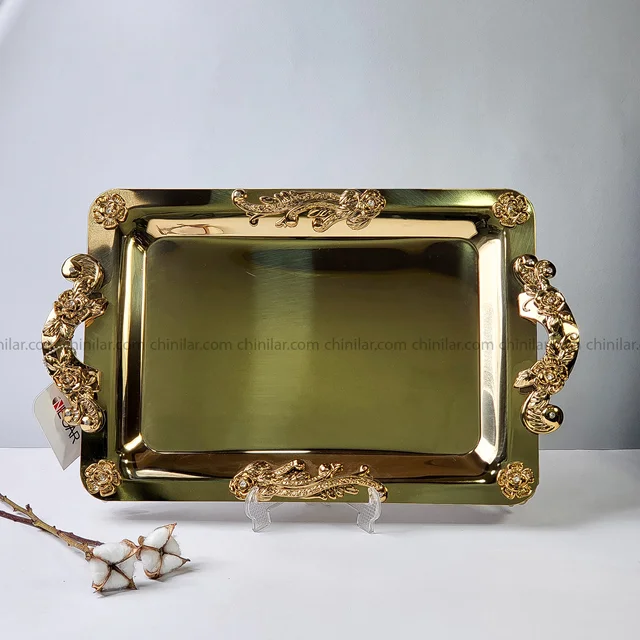 طرح ظریف و چشمنواز گلستان روی دستههای سینی حک شده و جلوهای کلاسیک و شیک به آن بخشیده است. دستهها و پایهها از جنس ABS با آبکاری طلایی ثابت هستند که به مرور زمان تغییر رنگ نمیدهند و لایه آبکاری آنها پوستهپوسته نمیشود.