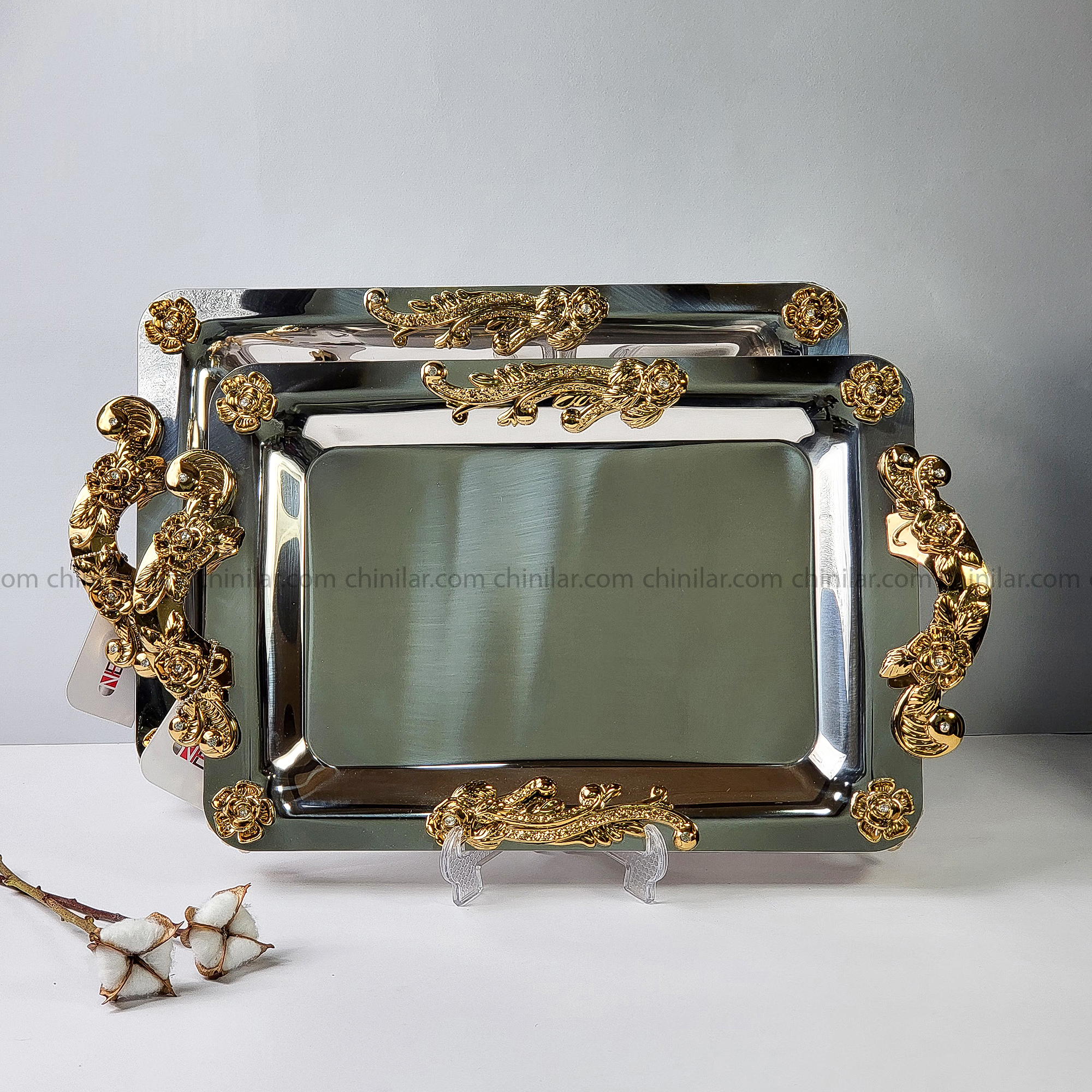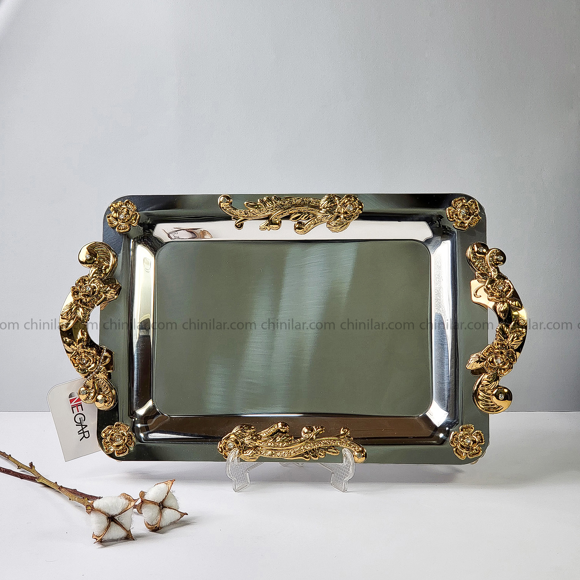 سینی استیل نگار طرح گلستان کد 419 – سایز کوچک، دسته طلایی