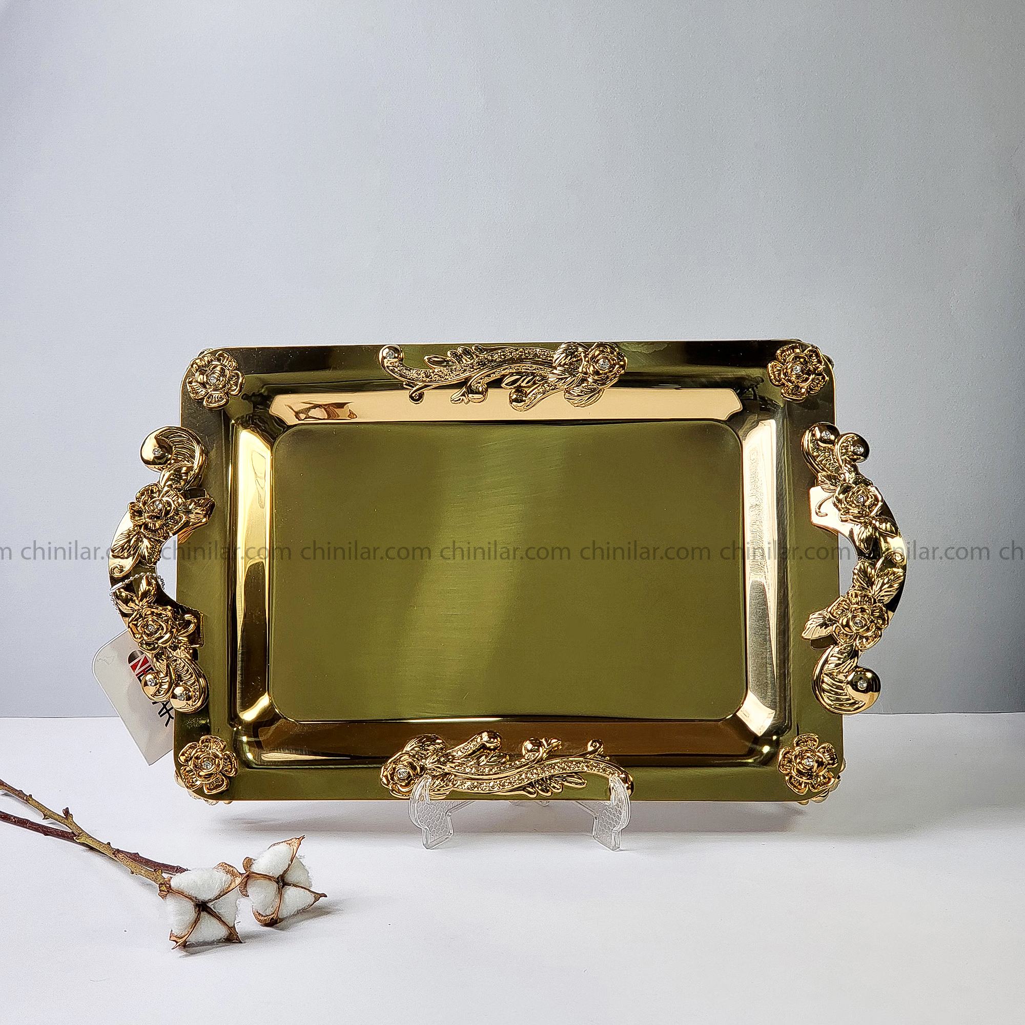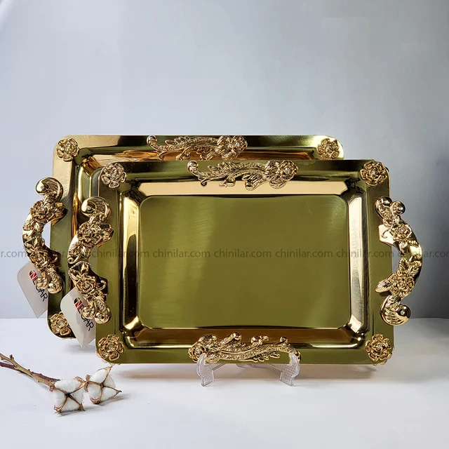 طراحی گلستان بهصورت ظریف روی دستههای سینی کار شده و جلوهای لوکس و کلاسیک به آن بخشیده است. دستهها و پایهها از ABS با آبکاری طلایی ثابت ساخته شدهاند که با گذر زمان پوستهپوسته یا کدر نمیشوند.