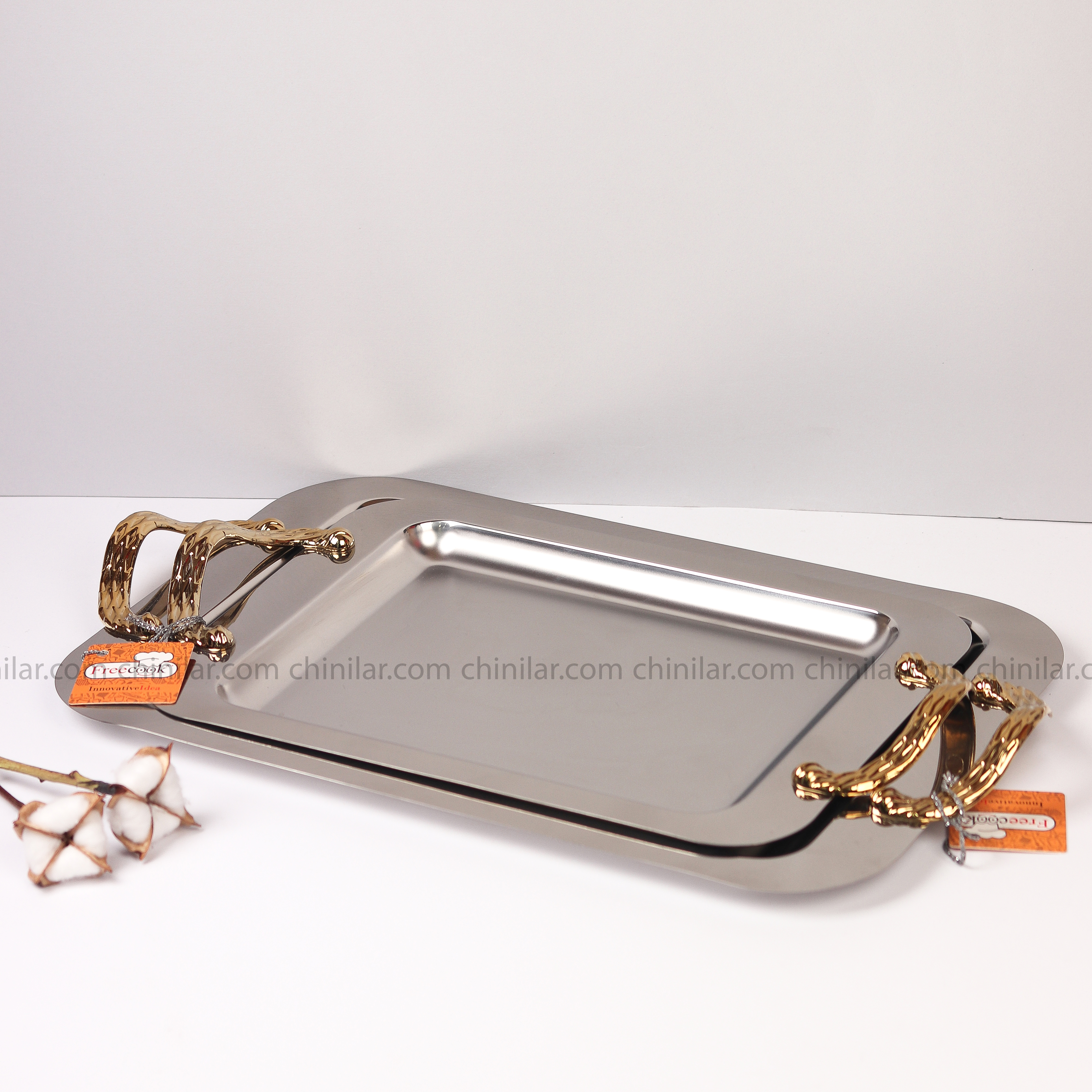 سینی استیل مستطیل دوتایی فری کوک کد 189 دسته طلایی