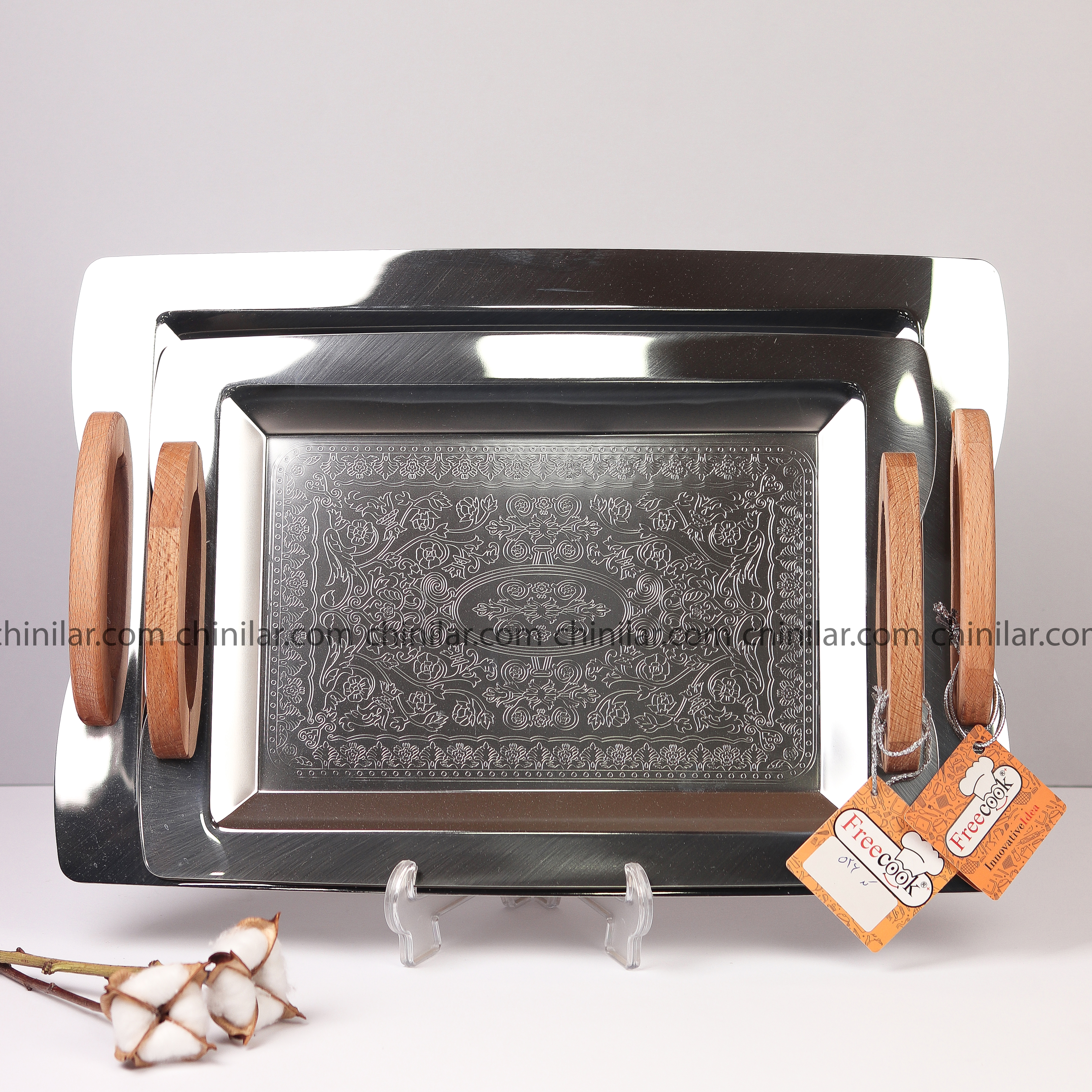سینی استیل مستطیل فری کوک سایز بزرگ دسته چوبی