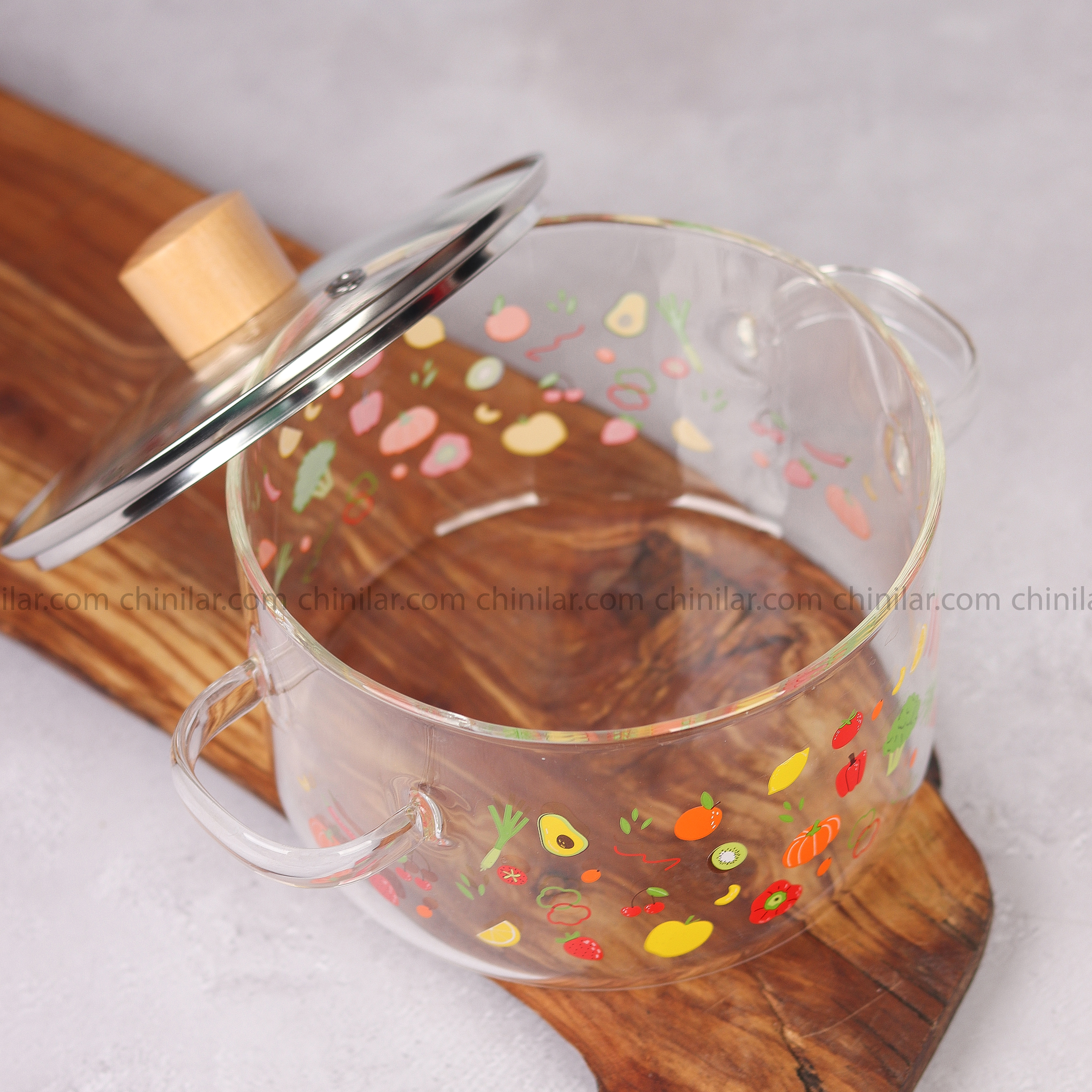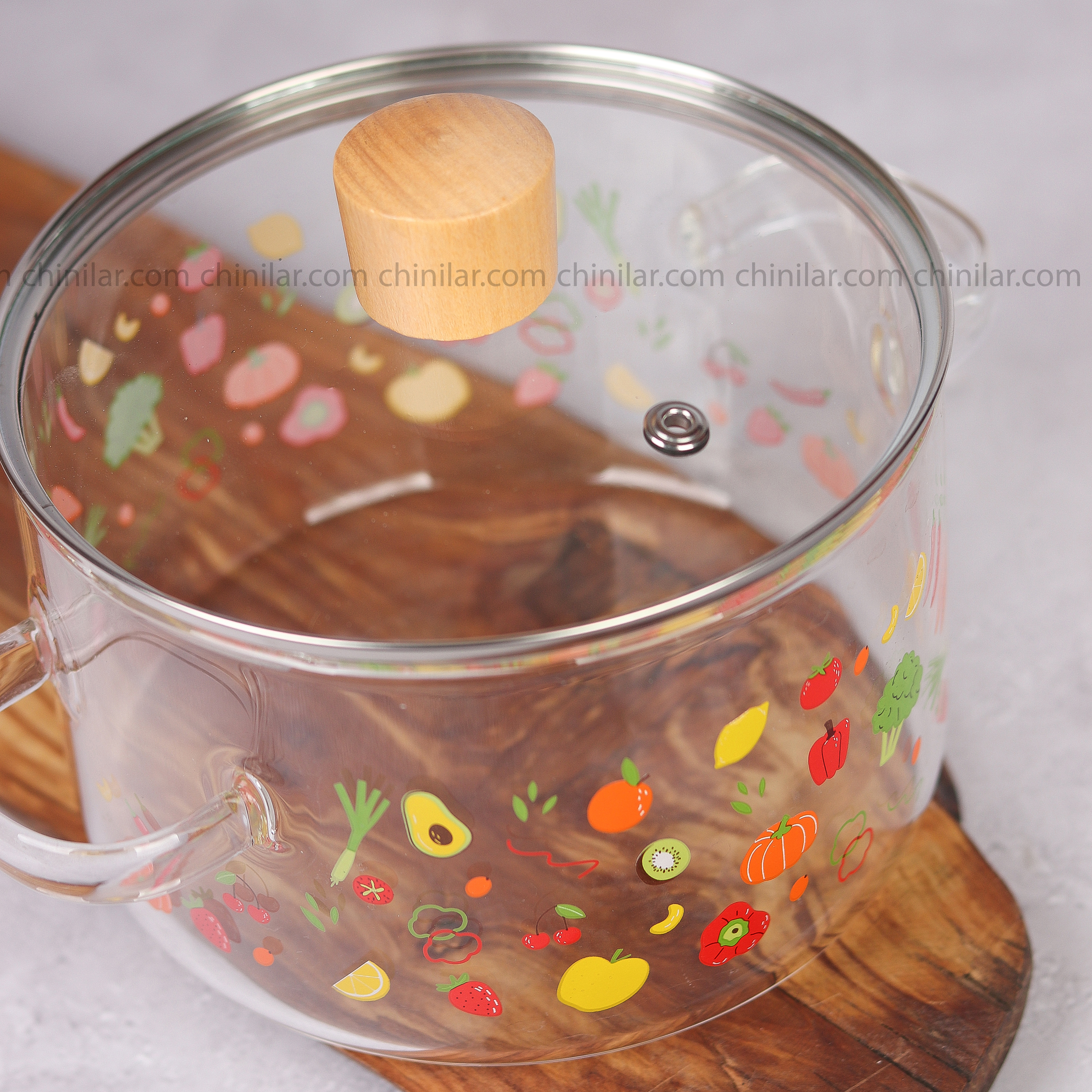قابلمه پیرکس طرح میوهای با ظرفیت 1800 میلیلیتر، انتخابی کاربردی و جذاب برای آشپزی روزمره و سرو غذاست. بدنه شفاف پیرکس امکان مشاهده محتویات داخل را فراهم میکند و دستههای بامبو روی درب راحتی و زیبایی بیشتری به محصول داده است. تعداد محصول: ۱ قابلمه + ۱ درب است.