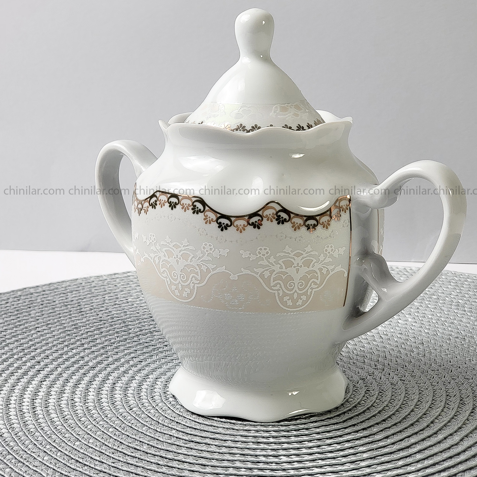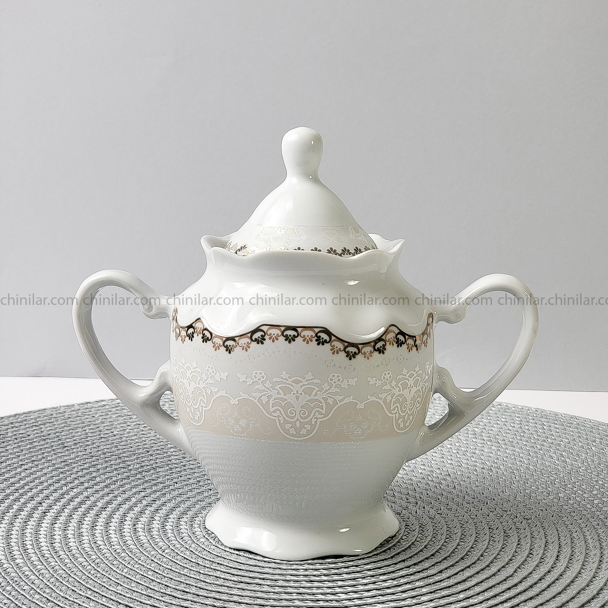 قندان طرح 814 از سری ظروف چینی نیوبن پردیس، با طراحی لوکس و پیکرهی آنجلیکای خاص، ترکیبی از ظرافت و کارایی را به نمایش میگذارد. نقوش نقرهای در کنار خطوط طلایی لب ظرف، زیبایی این قندان را دوچندان کرده و آن را به انتخابی ایدهآل برای سرو شکر در مهمانیها یا استفاده روزمره تبدیل میکند.
