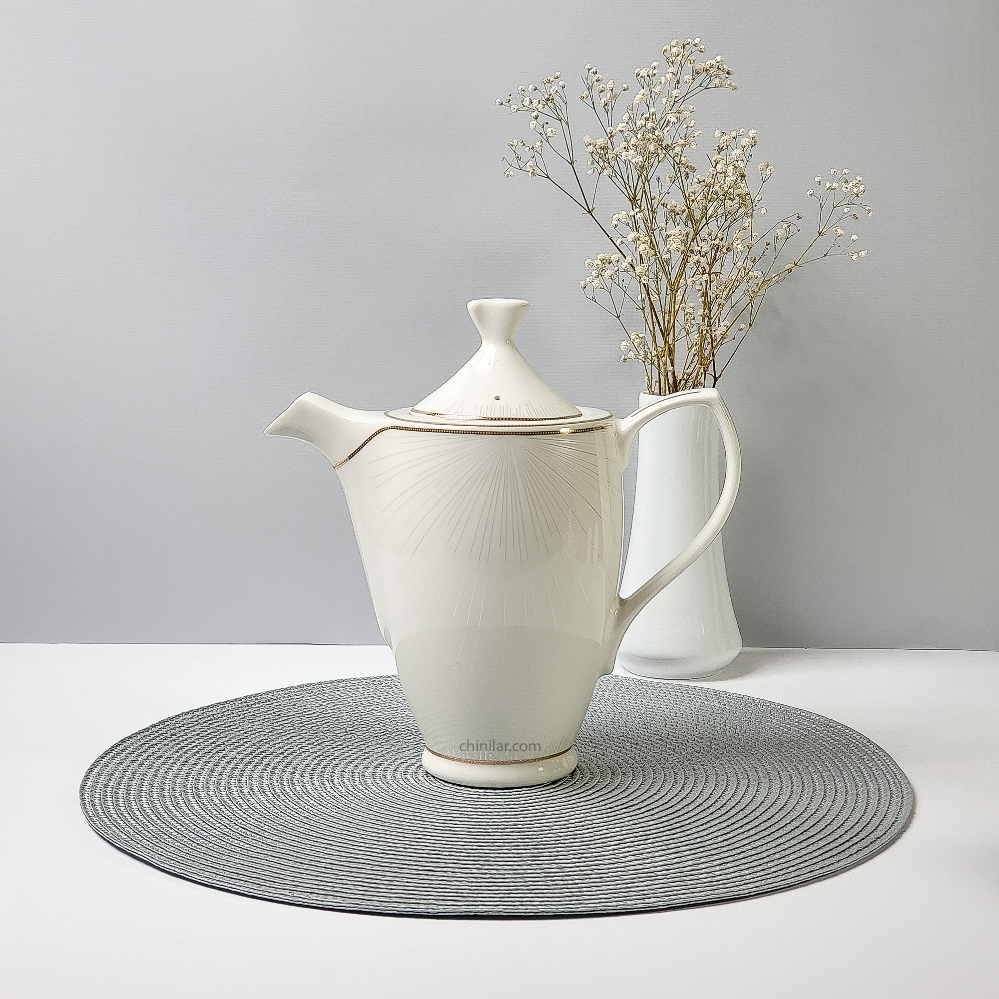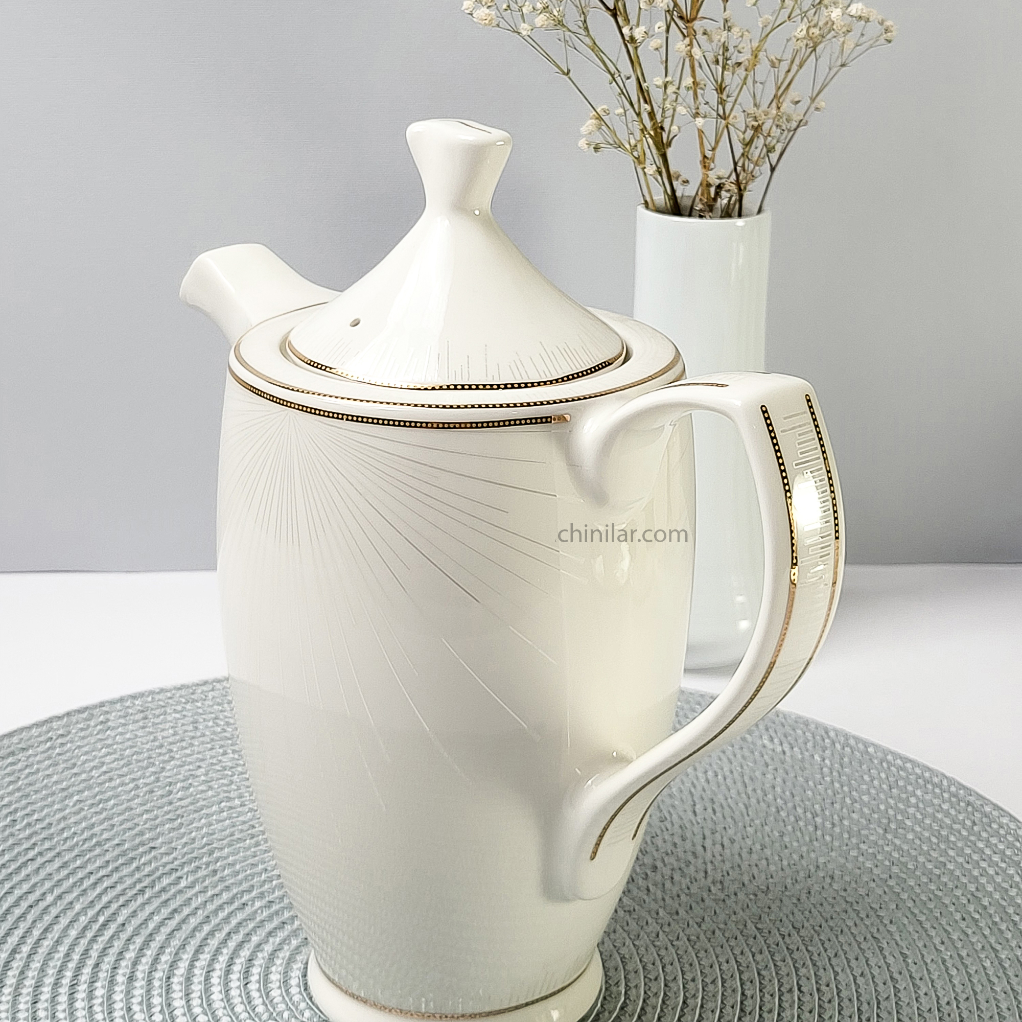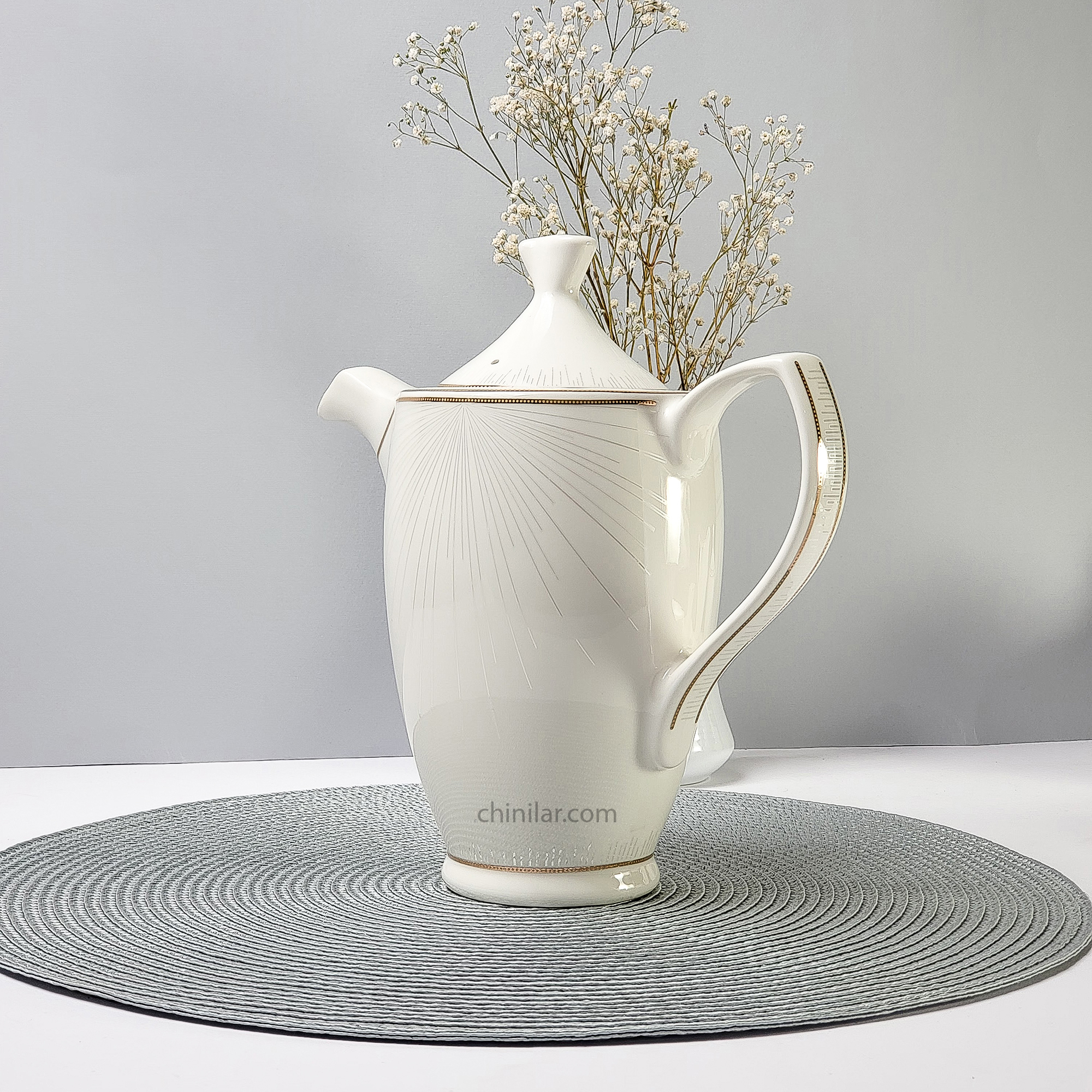 طرح لیانا با نقشهای نقرهای شعاعی منظم که از مرکز به لبهها گسترش یافته، همراه با خطوط طلایی بسیار ظریف در لبهها، حس ظرافت و وقار را در هر قطعه ایجاد میکند. این قوری نیز از این سبک پیروی کرده و با تناسب دقیق بین بدنه، دسته و درپوش، فرمی متعادل، خوشریخت و کاربردی دارد.