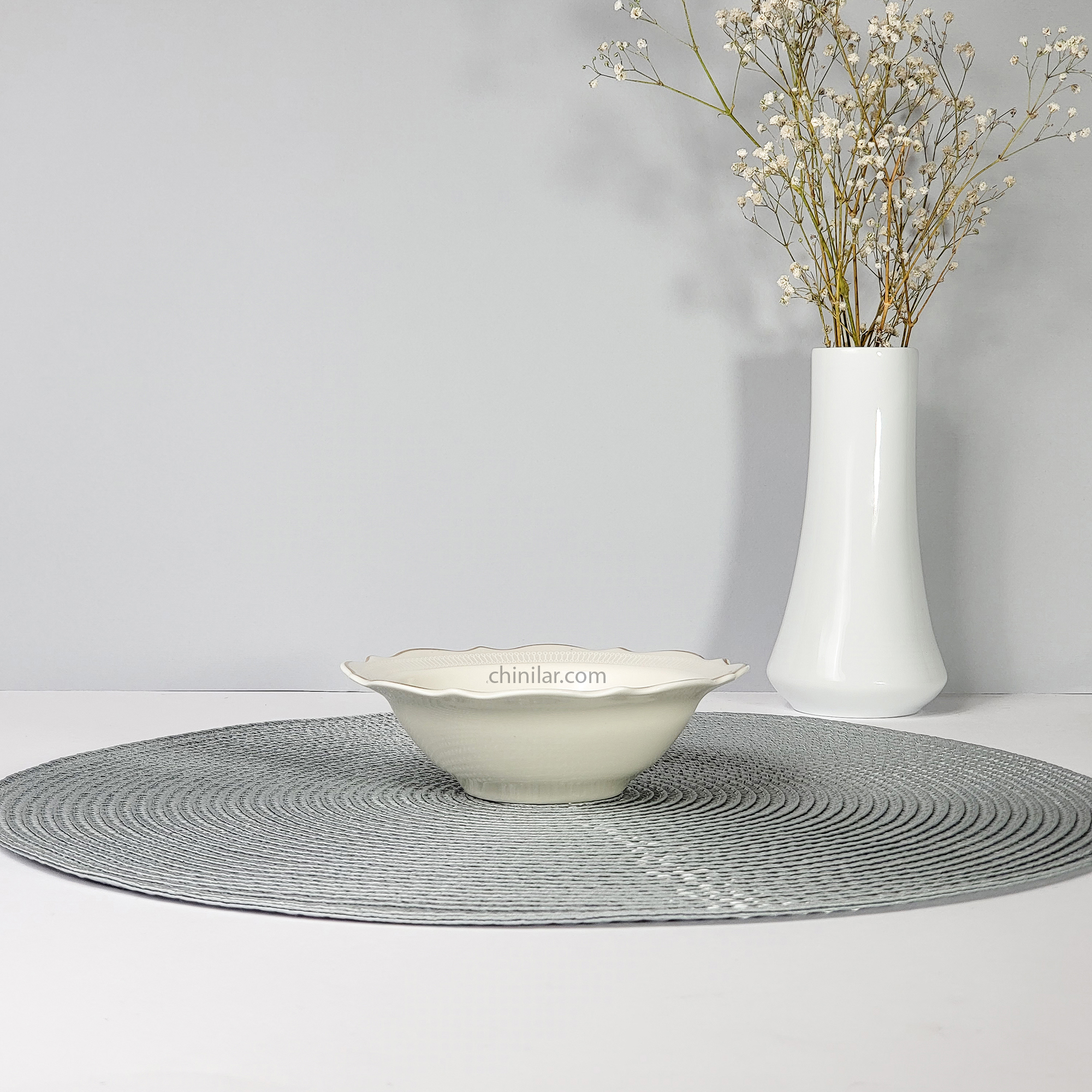 پیاله طرح دلارام 3007 از برند چینی دارسی، با طراحی کلاسیک و جزئیاتی چشمنواز، انتخابی زیبا و کاربردی برای سرو انواع دسر، ترشی، زیتون، ماست و سایر پیشغذاهاست. طراحی بدنه با لبههای انحنادار و فرمدار، همراه با نقوش منظم نقرهای و خطوط طلایی در حاشیه ظرف، جلوهای مجلل به میز پذیرایی شما میبخشد.