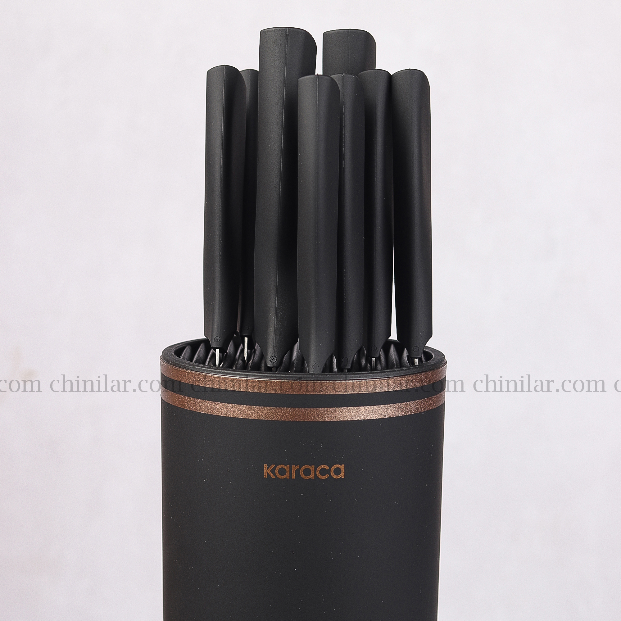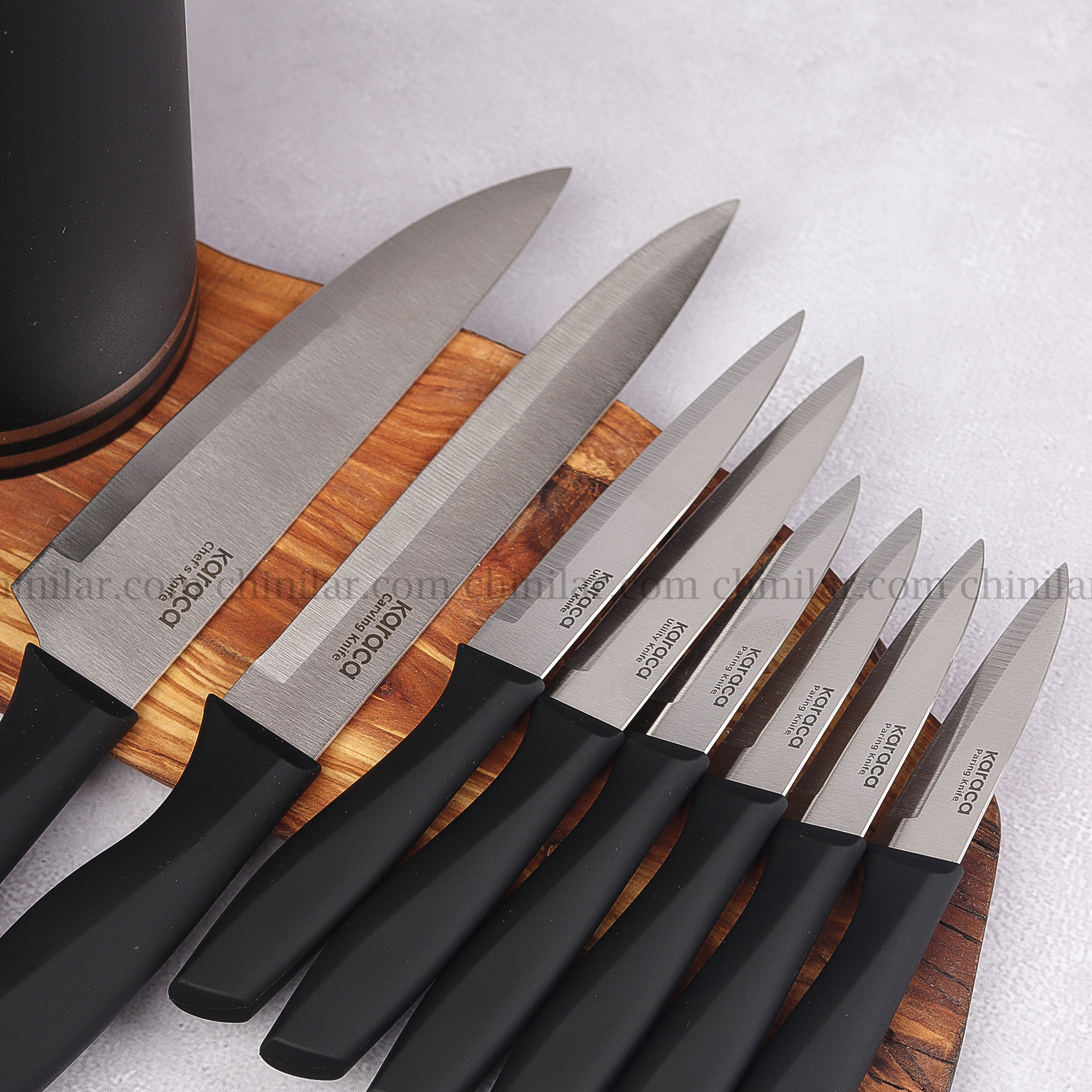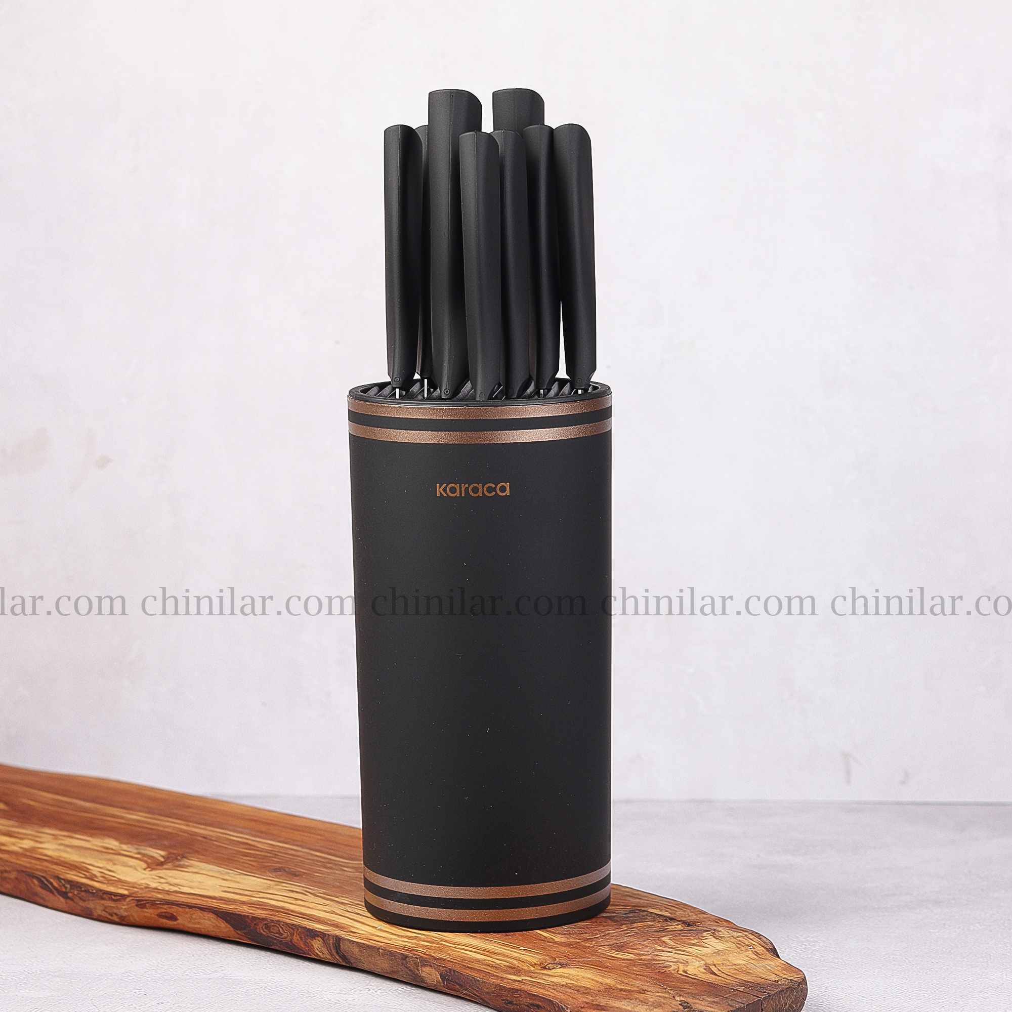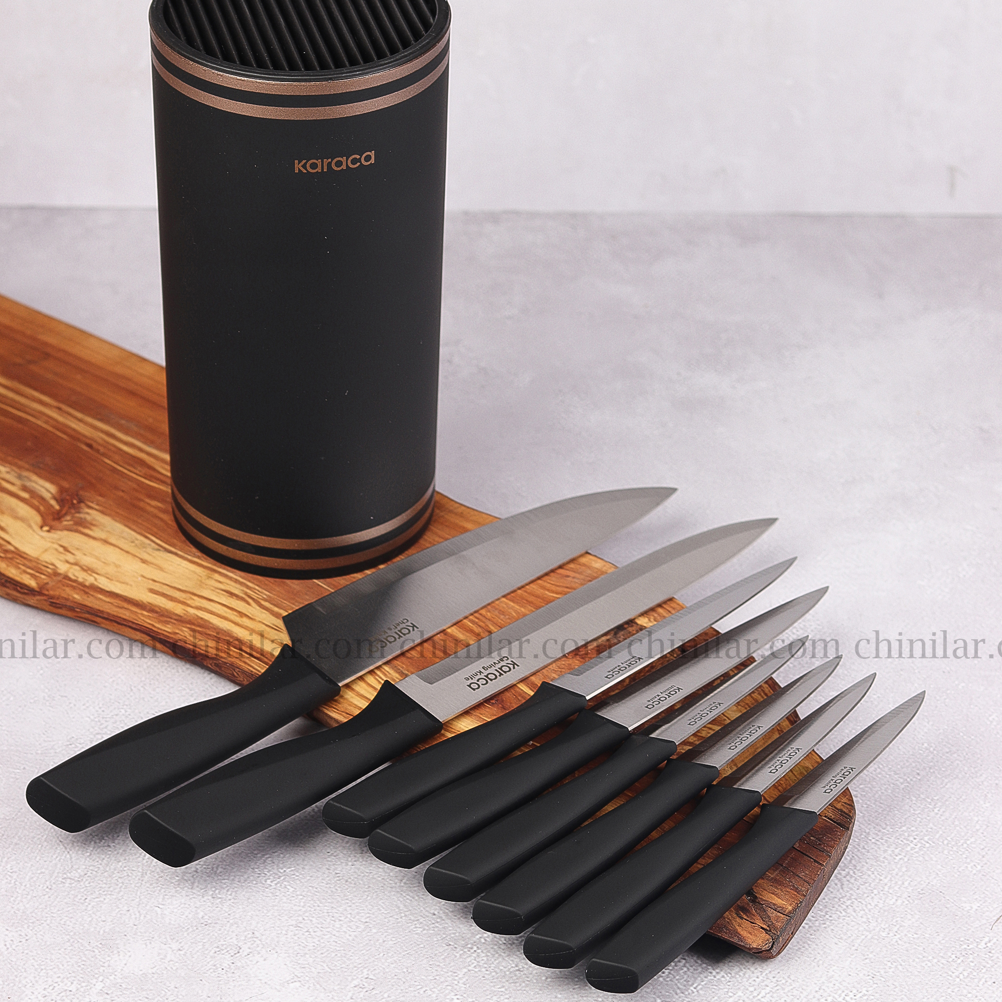 این مجموعه شامل 8 نوع چاقو کاربردی به همراه یک استند پلاستیکی مقاوم است که علاوه بر نظم بخشیدن به آشپزخانه، دسترسی سریع به چاقوها را فراهم میکند.