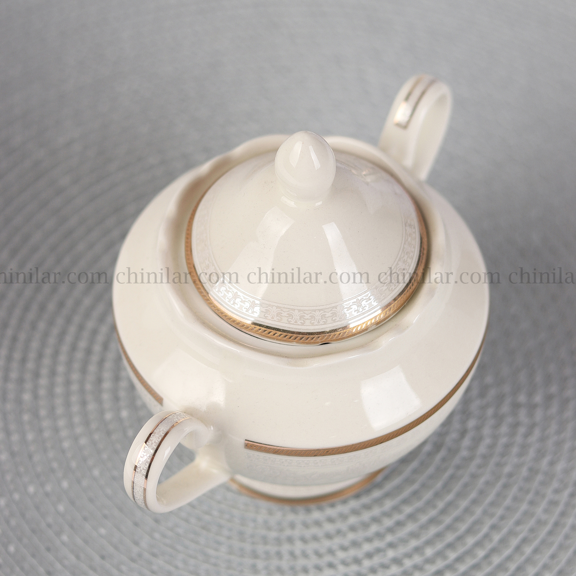 این سرویس با پیکره استخوانی رنگ و لعاب براق خود، جلوهای کلاسیک و درعینحال مدرن دارد. نقوش نقرهای هماهنگ با خطوط طلایی دور ظروف، ترکیبی از شکوه سلطنتی و ظرافت هنرمندانه را ارائه میدهد که در هر پذیرایی میدرخشد.