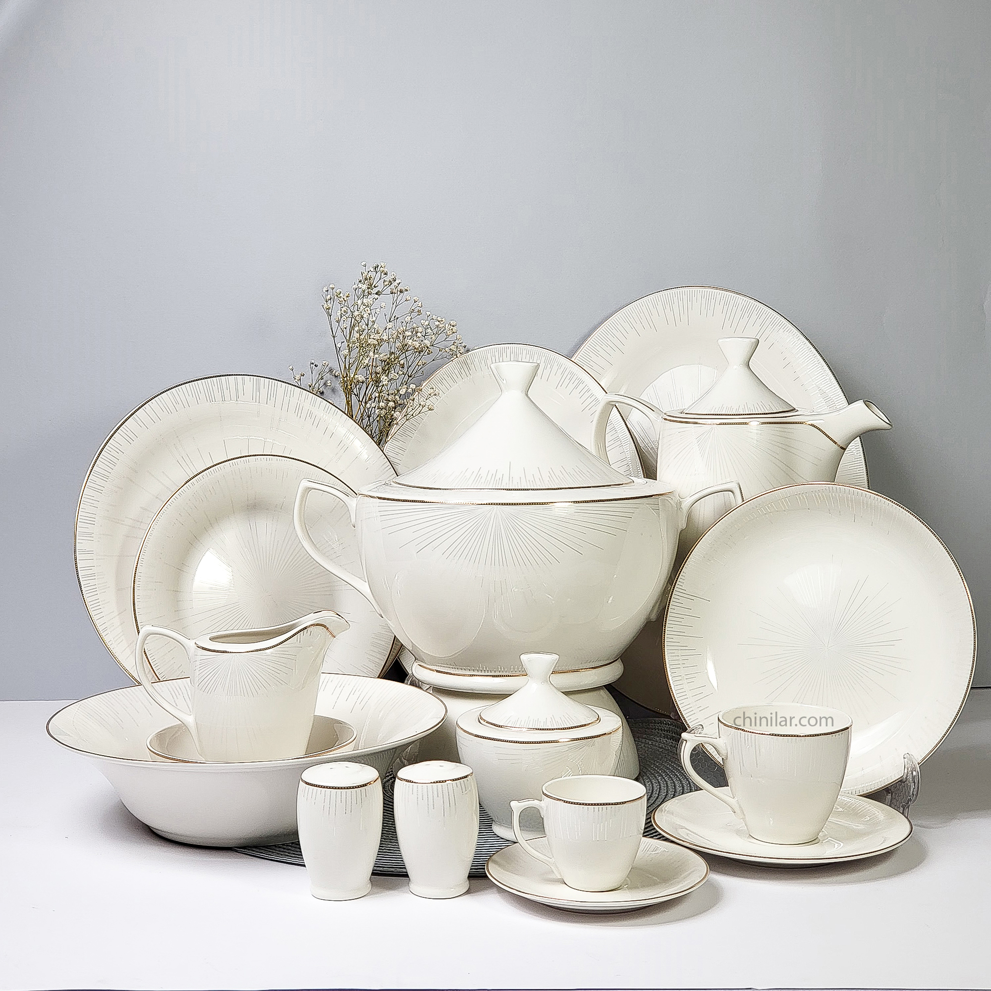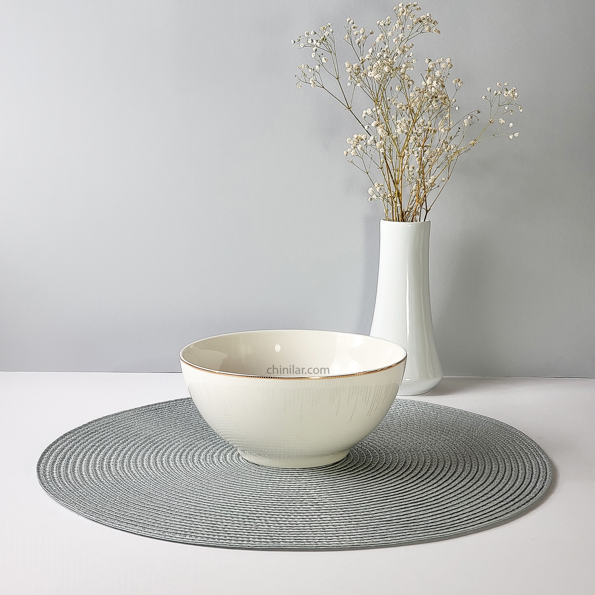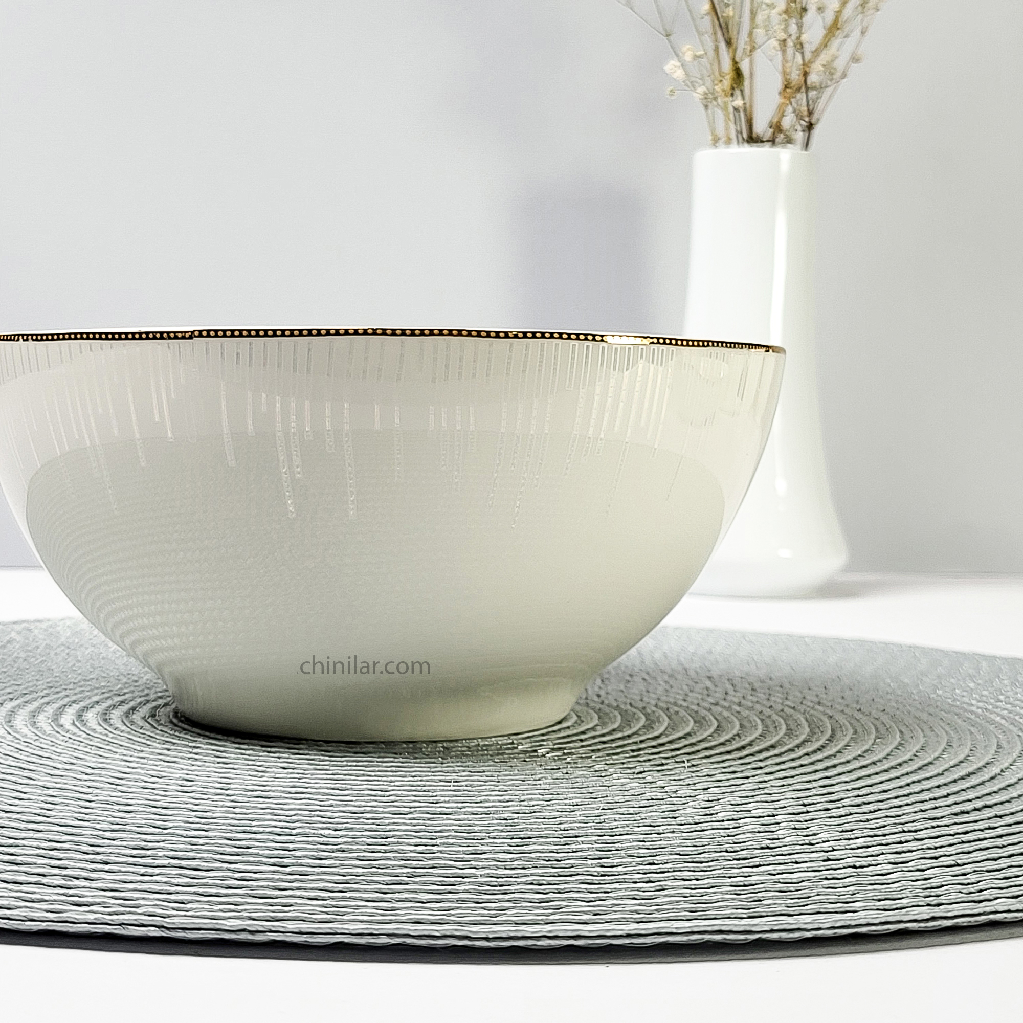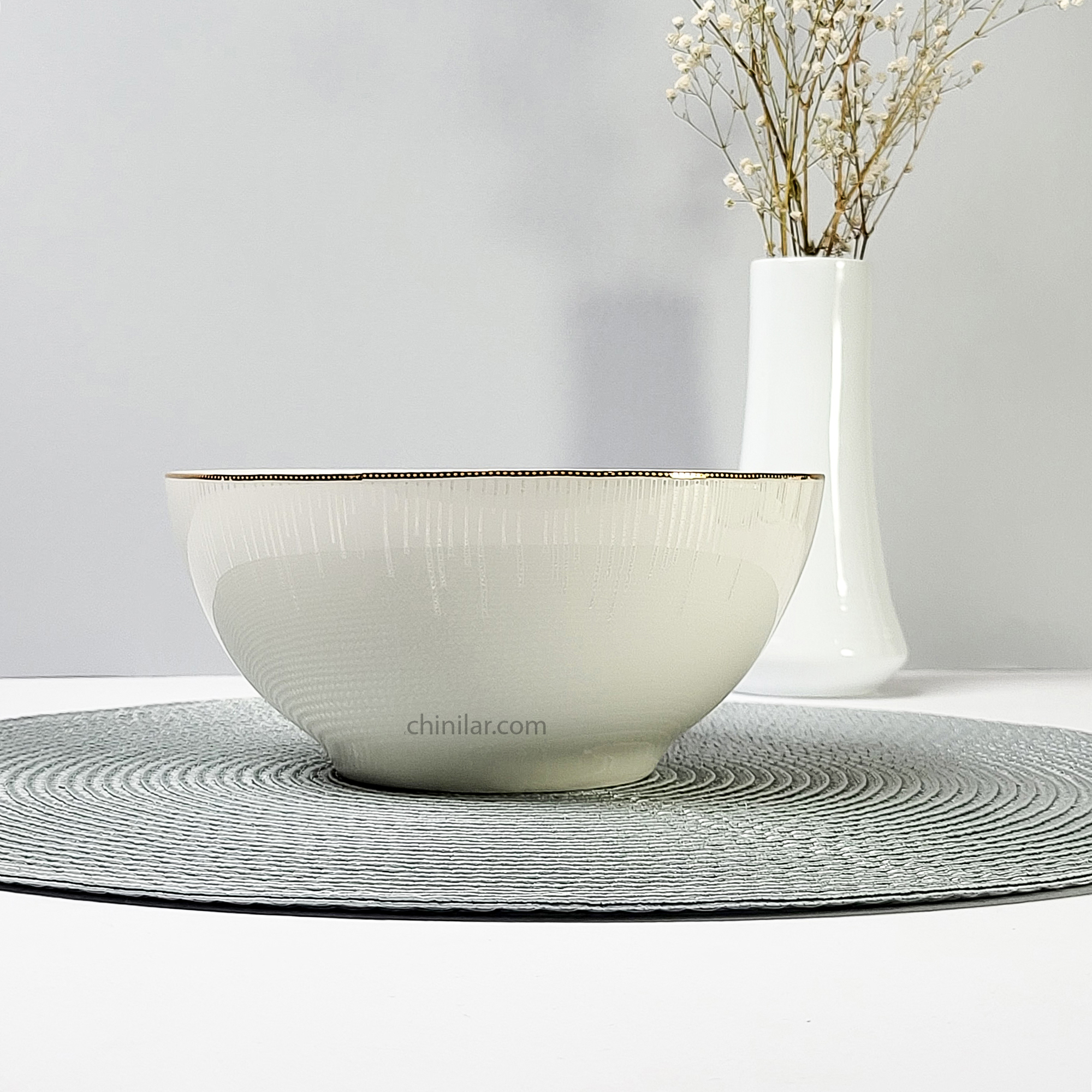 این کاسه با طراحی عمیقتر و بدنهای مقاوم در برابر حرارت، ضمن حفظ زیبایی ظاهری، عملکردی حرفهای برای استفاده روزمره یا پذیرایی رسمی فراهم میکند. نقوش شعاعی نقرهای و خطوط لبطلایی روی زمینهی کرم روشن، ظاهری باشکوه و هماهنگ با دیگر اقلام سرویس لیانا ایجاد کردهاند.