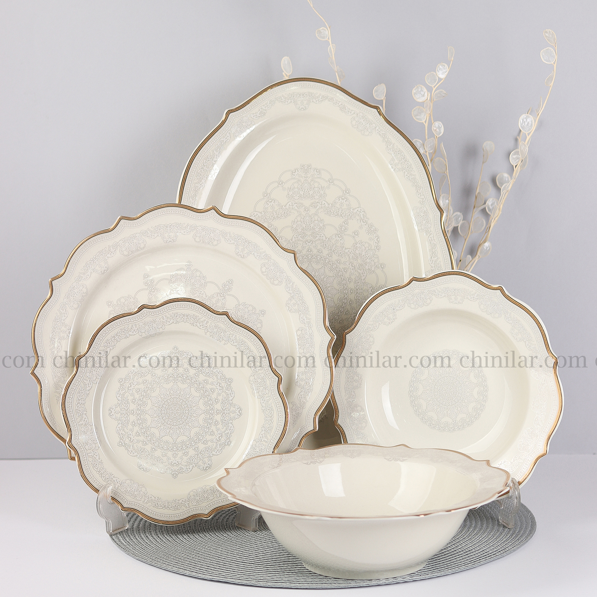 این سرویس با رنگ استخوانی گرم و درخشان، همراه با نقوش نقرهای ظریف و خطوط طلایی براق، جلوهای لوکس و سلطنتی ایجاد میکند که هم برای استفاده روزمره و هم برای مهمانیها عالی است.