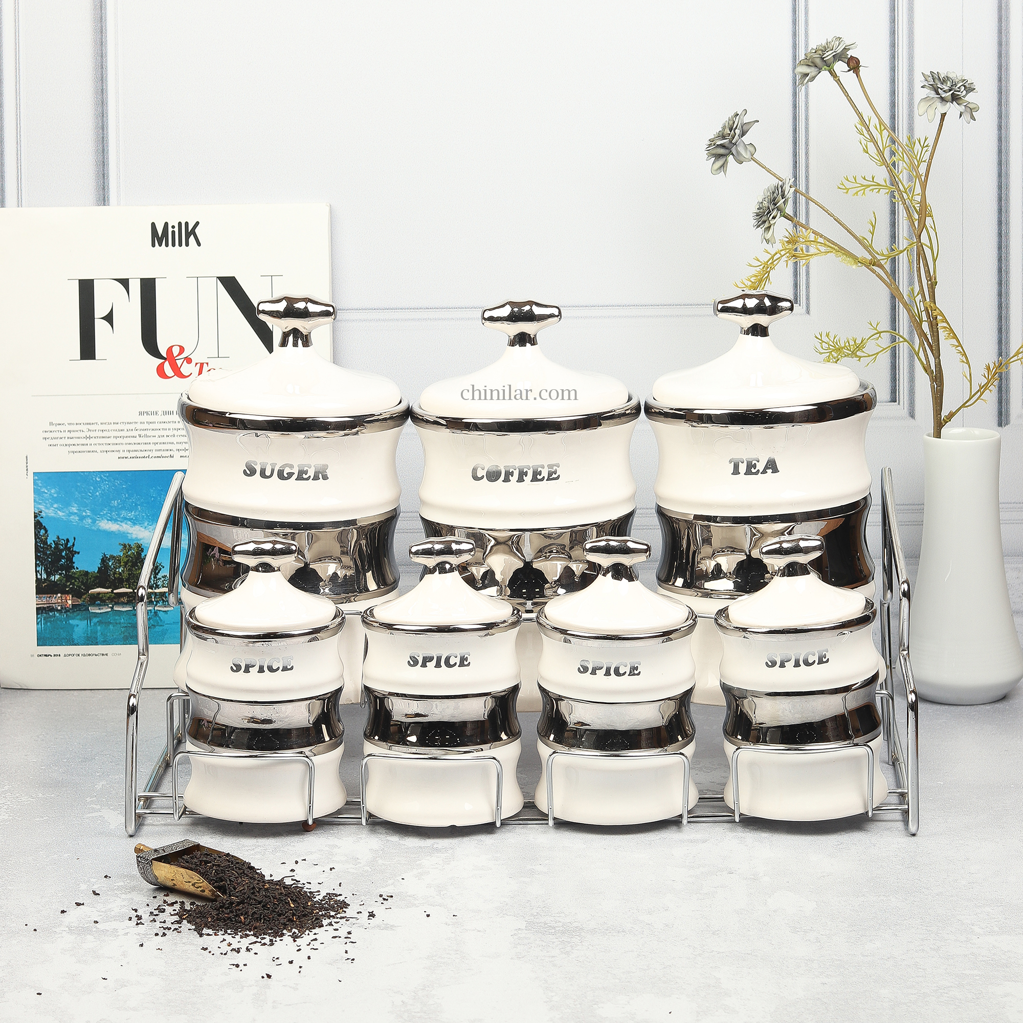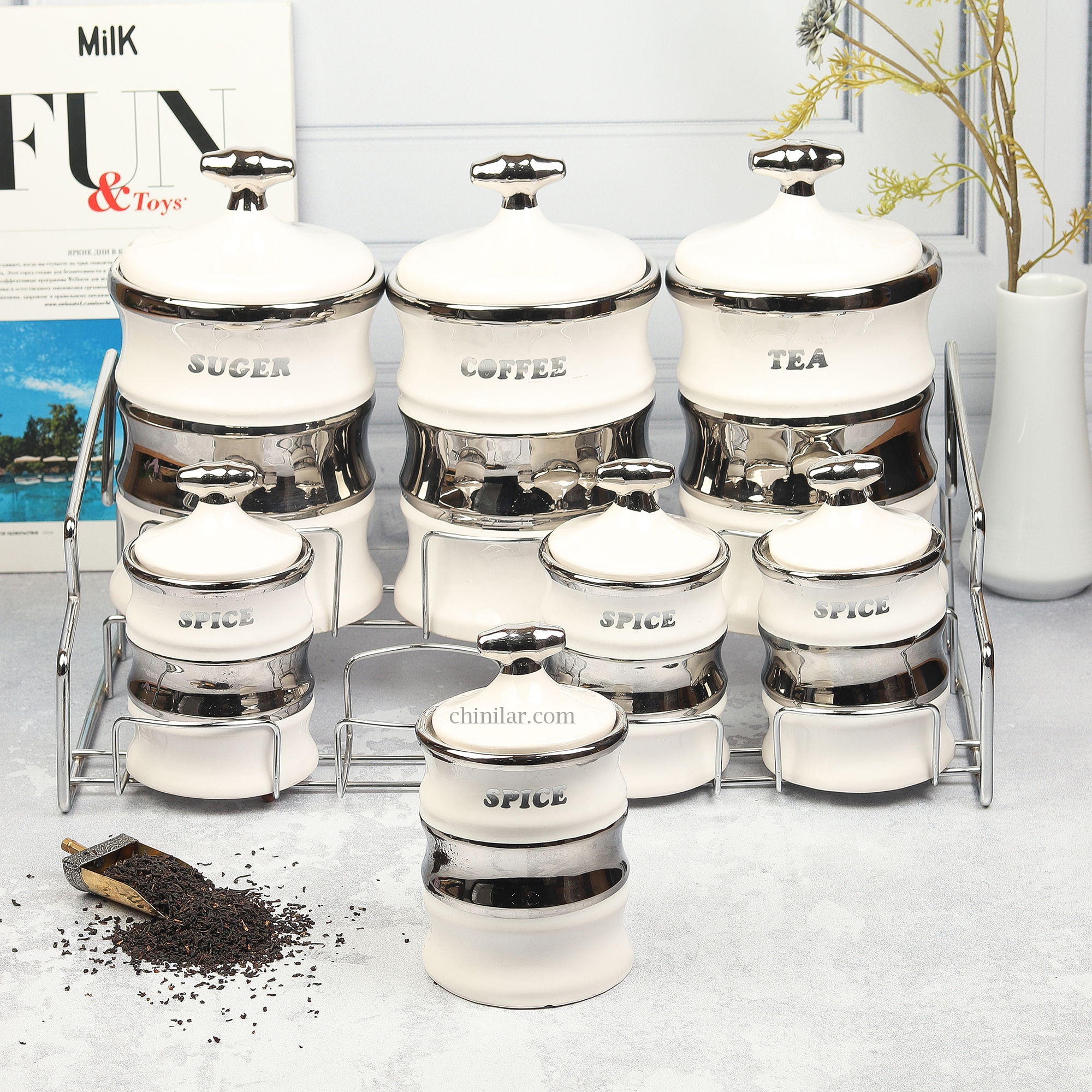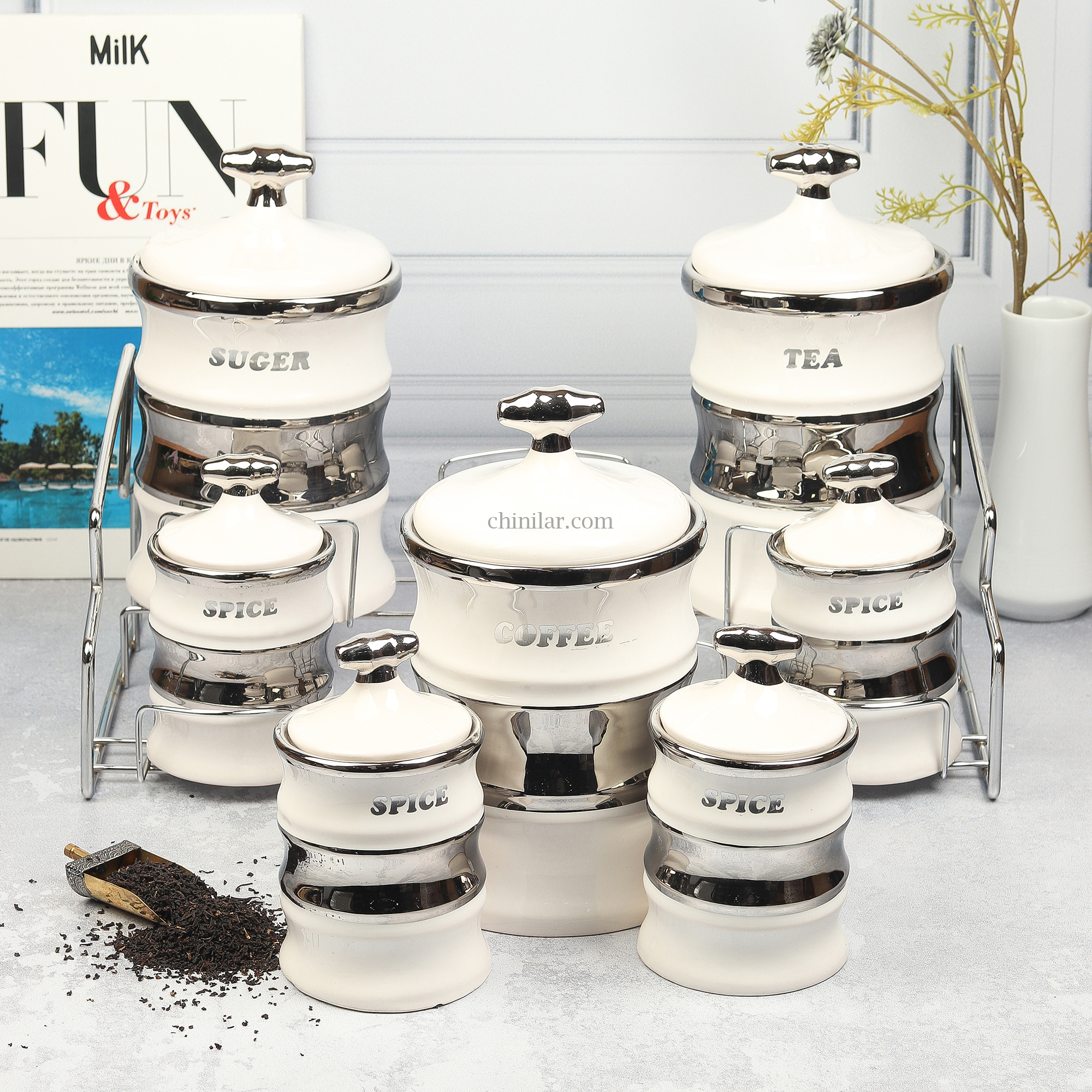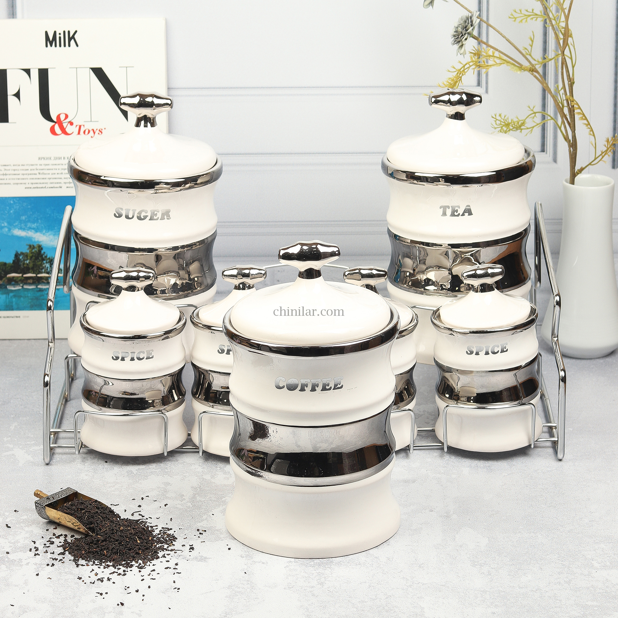 ویژگیهای محصول: شامل 7 ظرف سرامیکی: 3 عدد بانکه بزرگ برای چای، قهوه و شکر 4 عدد بانکه کوچک برای انواع ادویه جنس