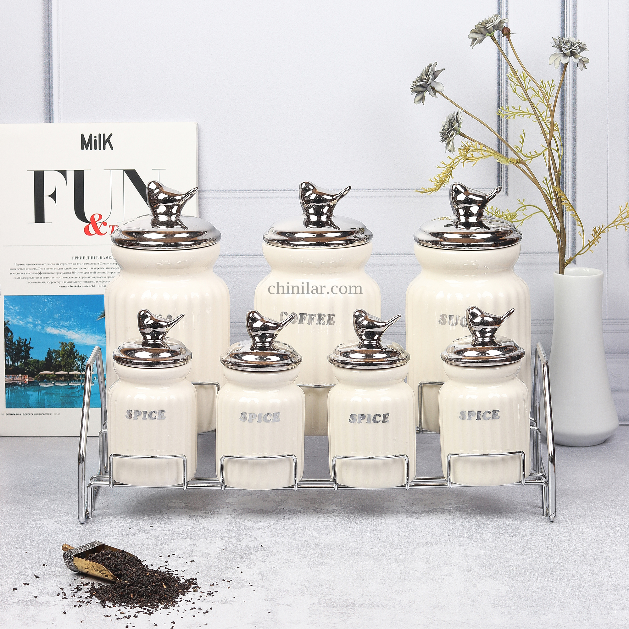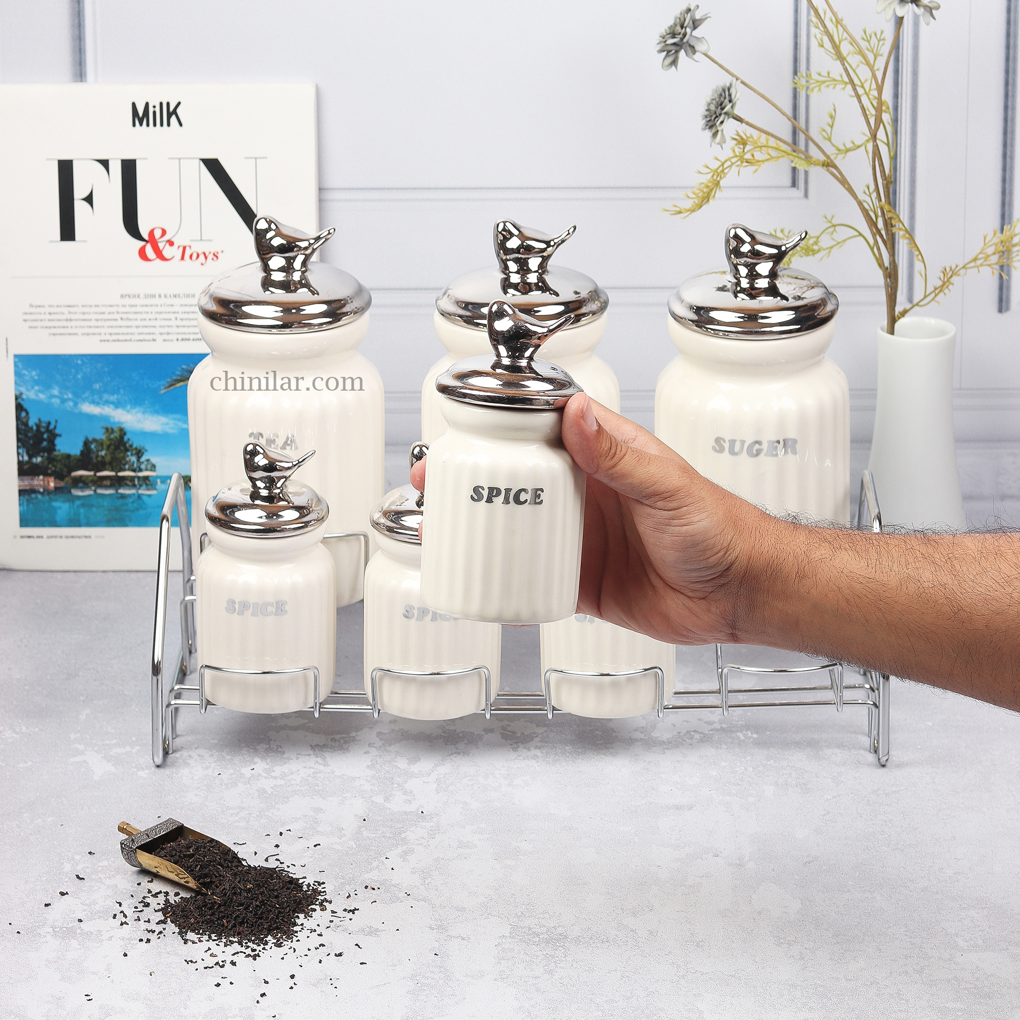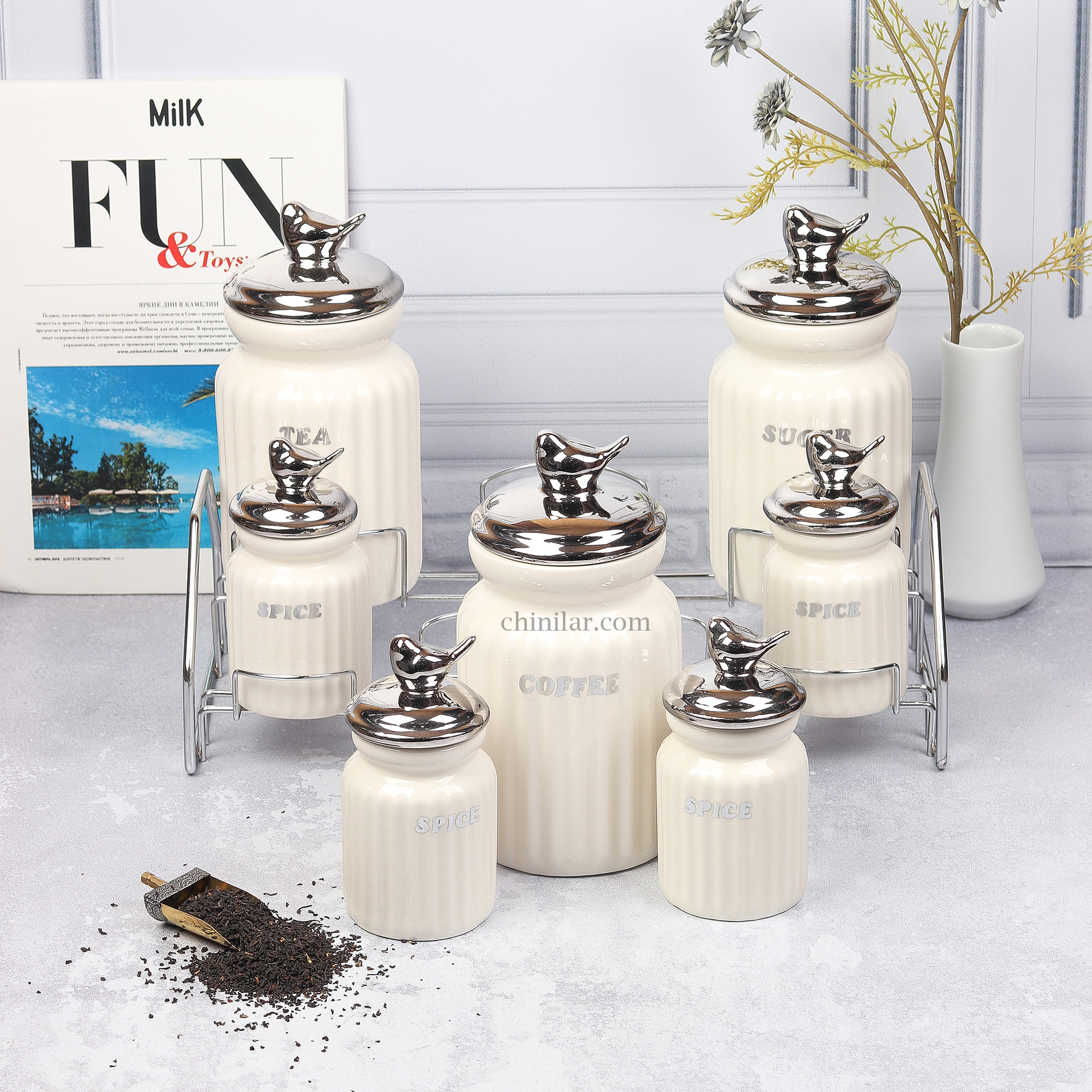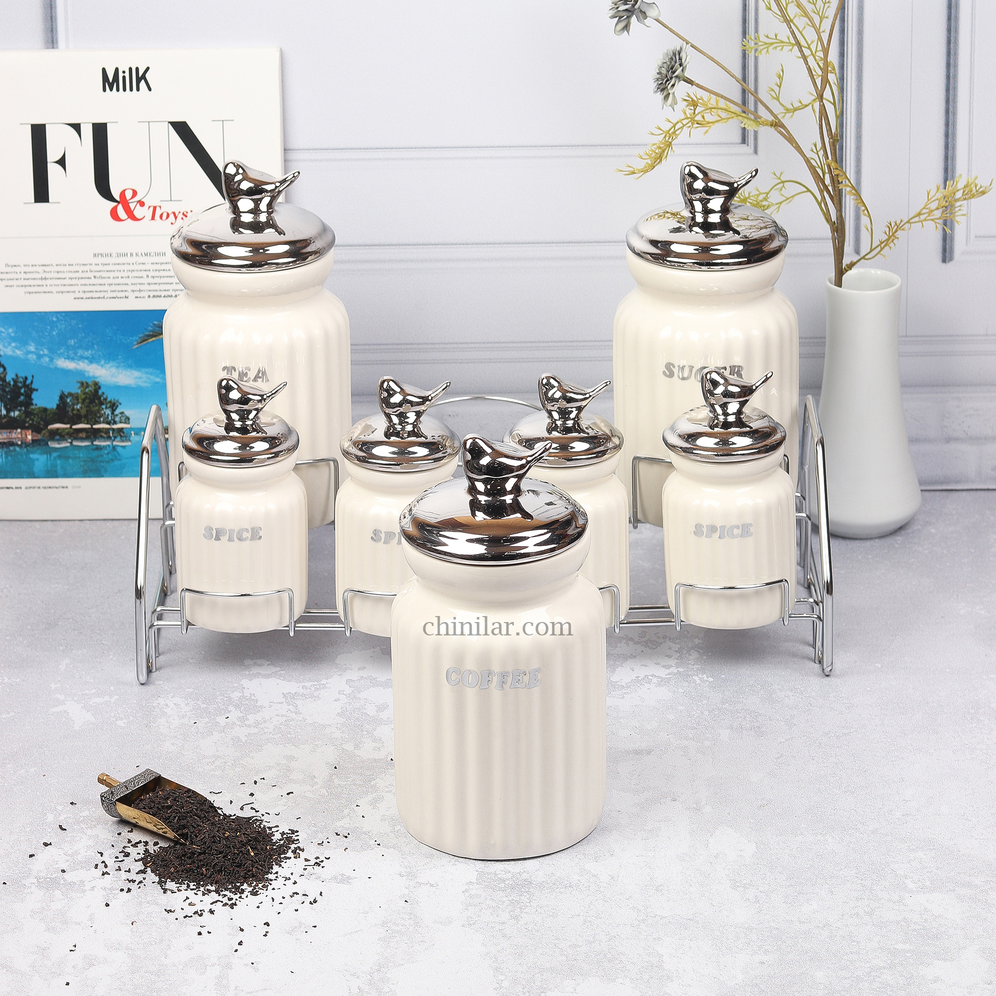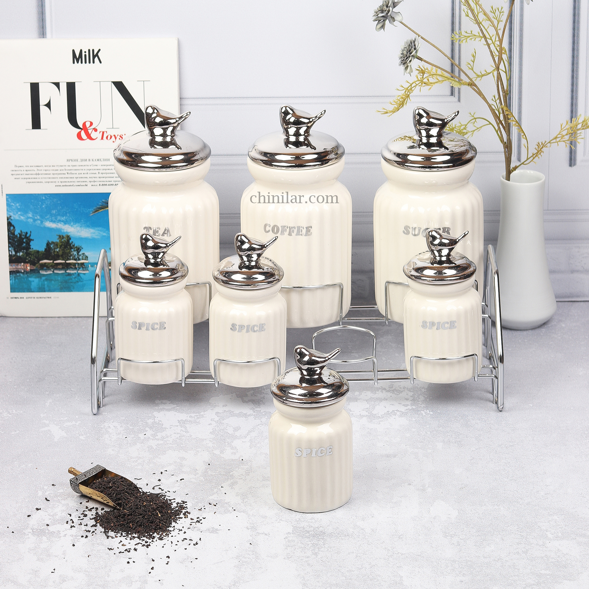 ویژگی‌های محصول: شامل 7 ظرف سرامیکی: 3 عدد بانکه بزرگ برای چای، قهوه و شکر 4 عدد بانکه کوچک برای انواع ادویه