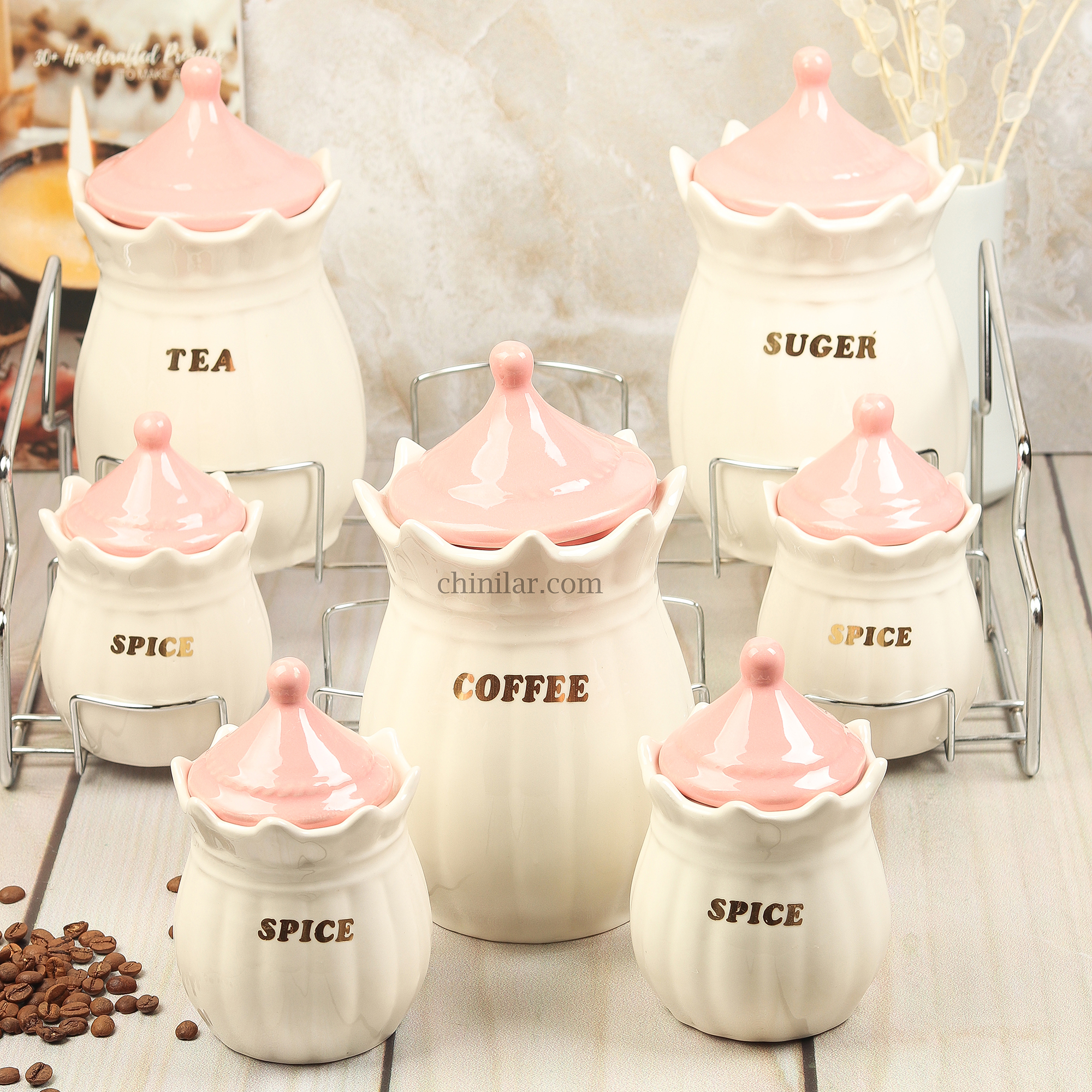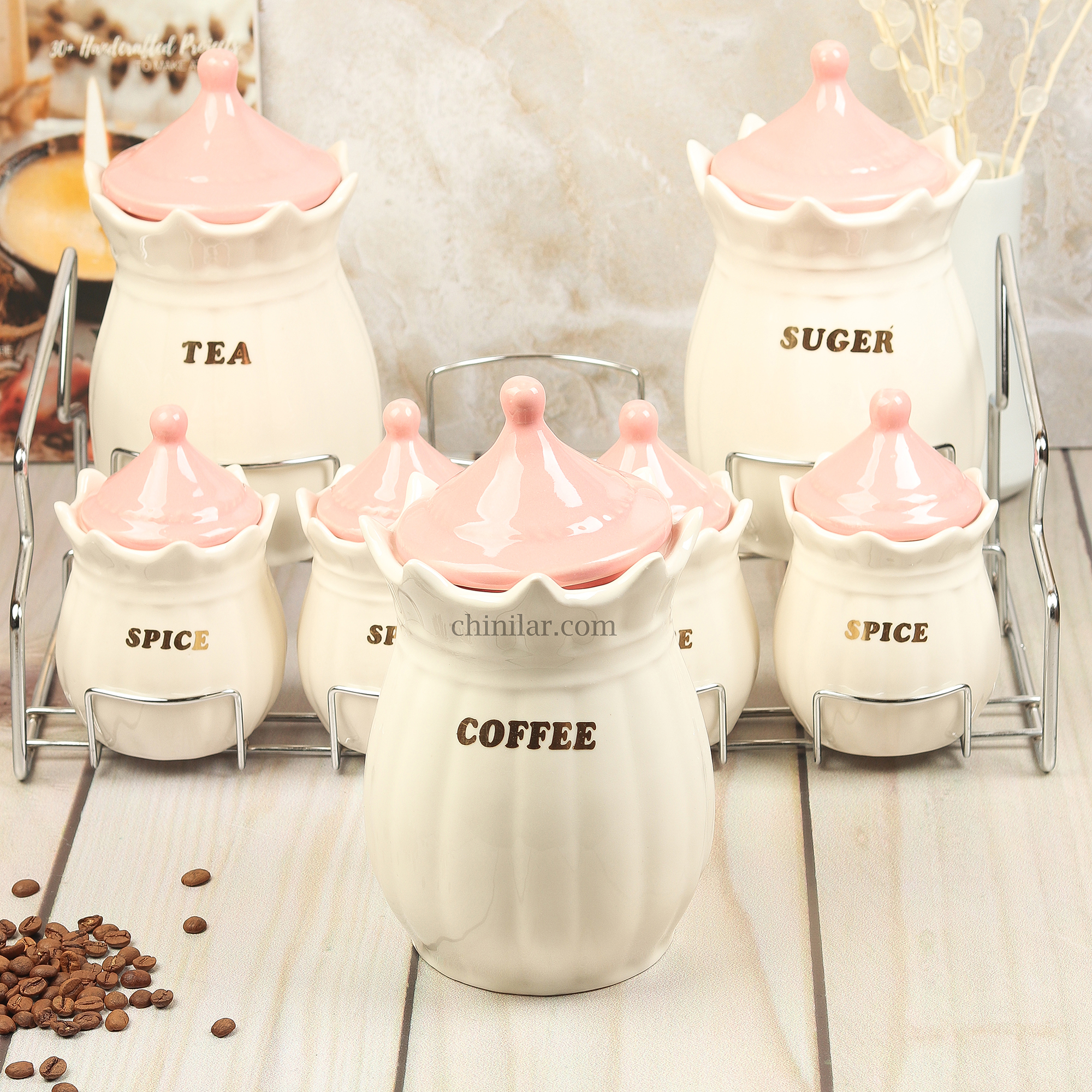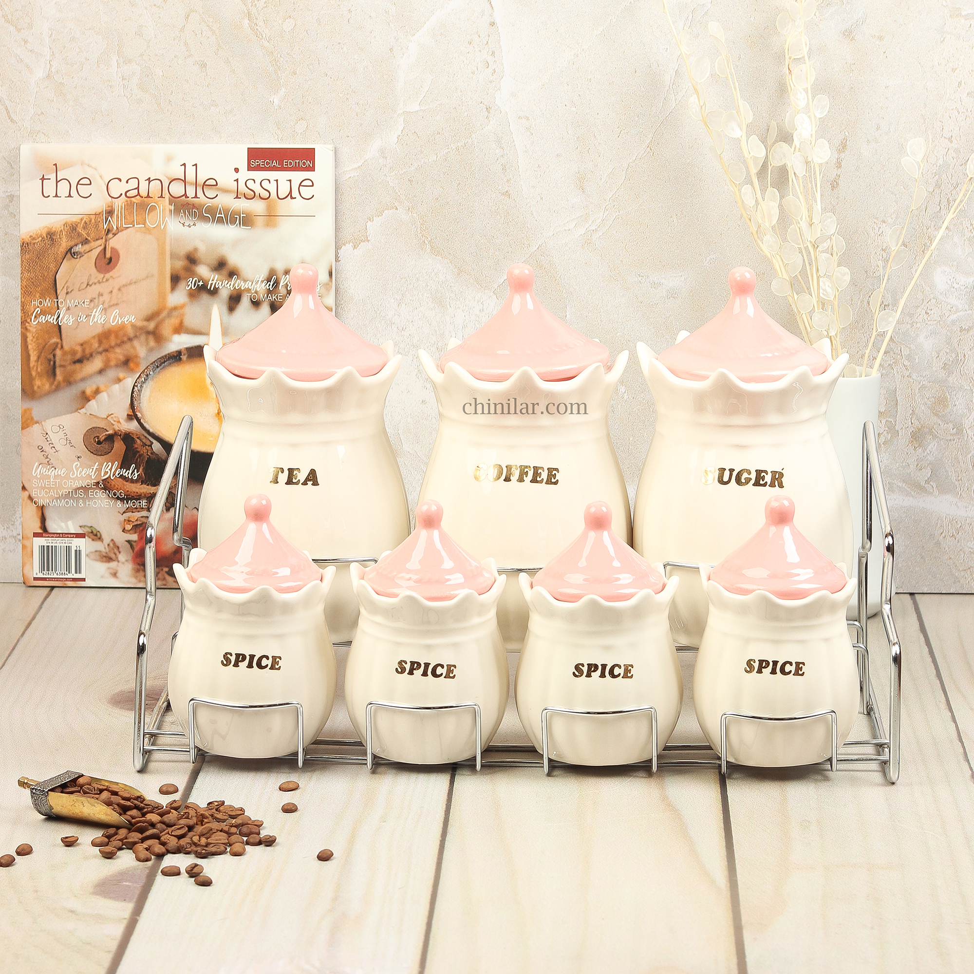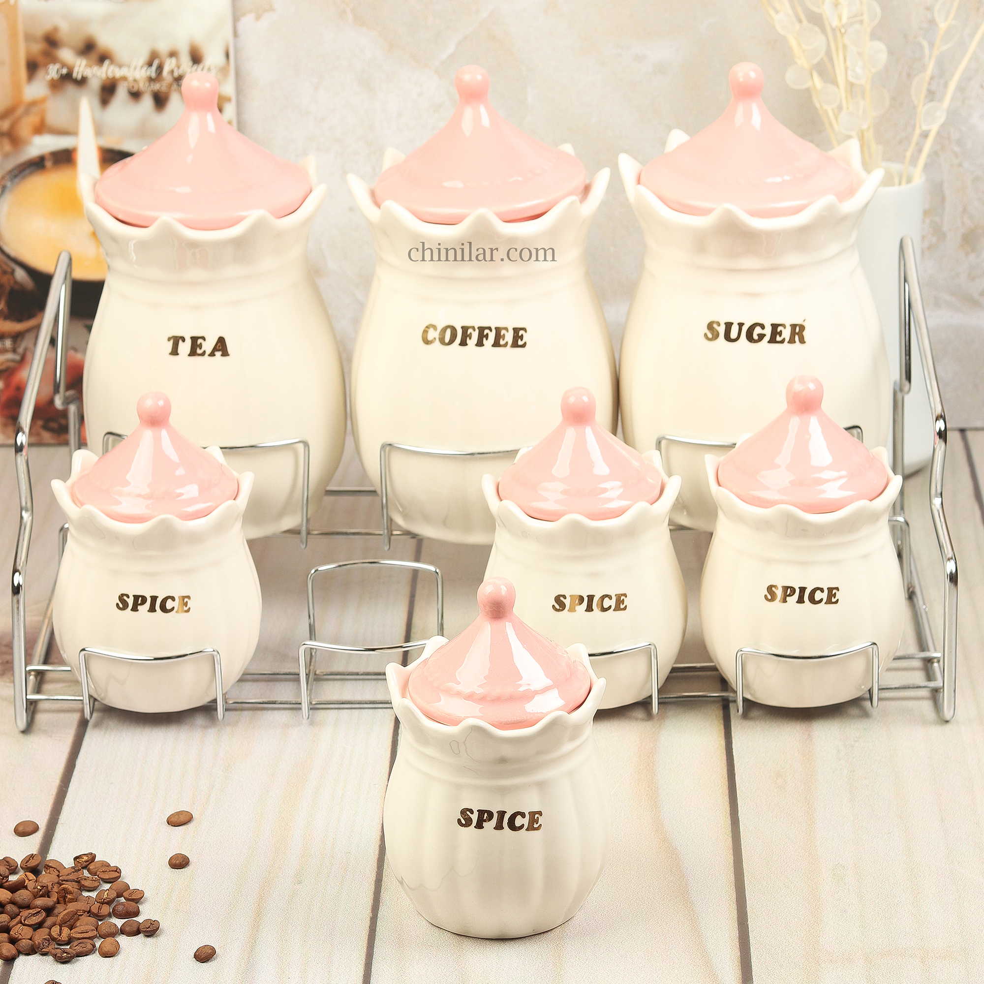 جنس ظروف: سرامیک با کیفیت بالا، لعابدار و مقاوم دربهای سرامیکی با طراحی زیبا و دستهدار پایه نگهدارنده محکم برای چیدمان مرتب و دسترسی آسان