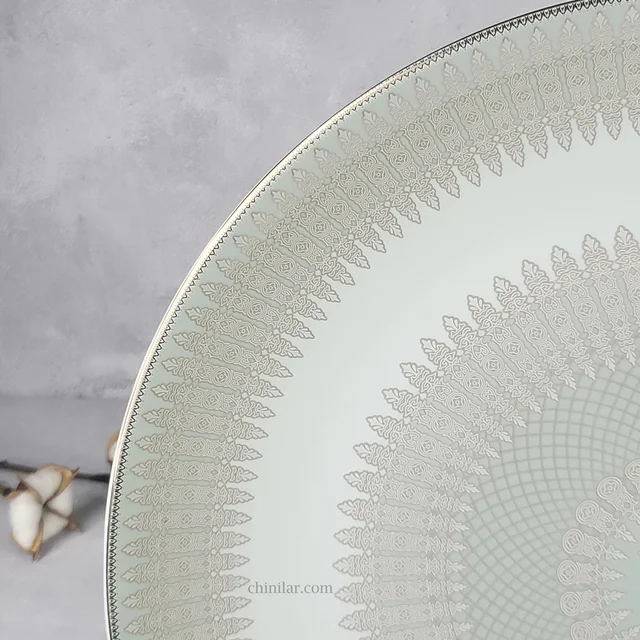 چینی درجه یک - دیس گرد بزرگ طرح غزل چینی لورین ، یک ظرف شیک و زیبا برای سرو غذاها و دسرهاست. طراحی هنری و جذاب آن با نقش و نگارهای خاص و تلفیقی از رنگ فیروزه ای روشن، جلوهای خاص به سفره شما میبخشد.